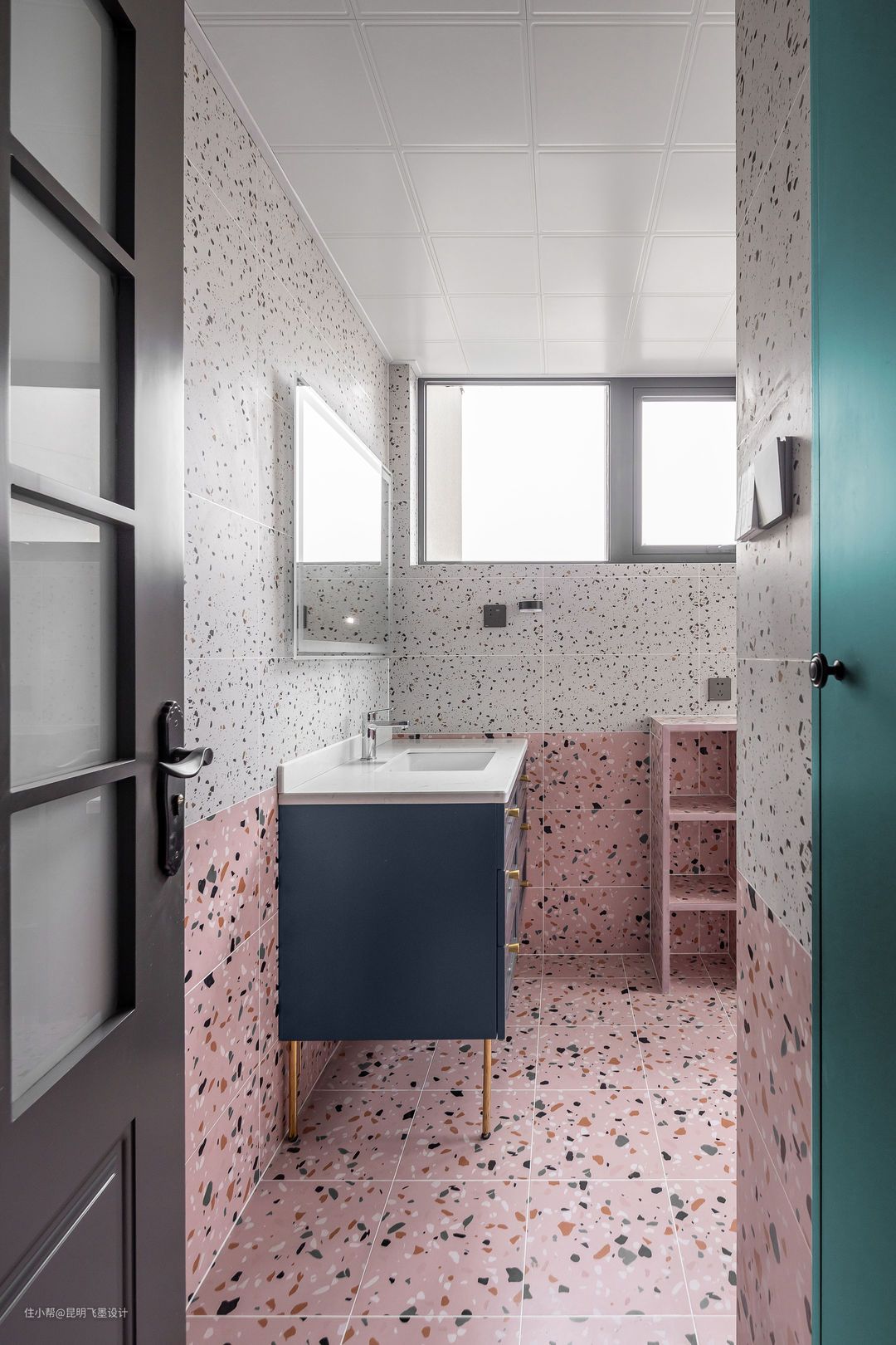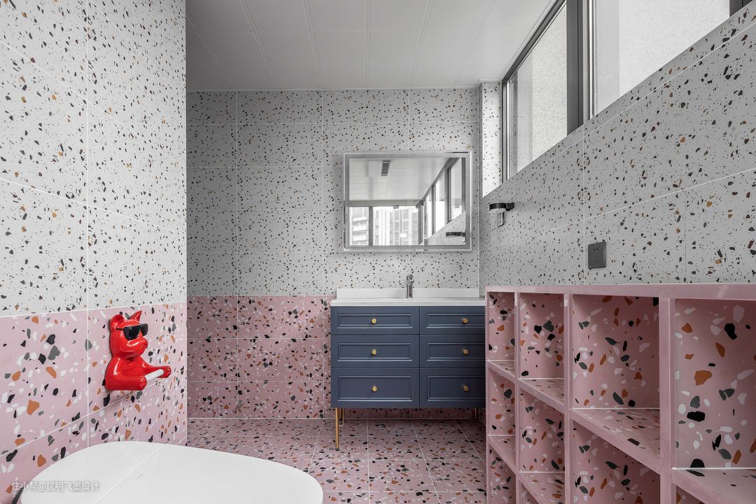 主卫生间空间 主卧空间主色为粉色,也蔓延到卫生间的瓷砖使用上。卫生间我们选用了粉色和白色的仿水磨石瓷砖的上下搭配。既少女又复古。