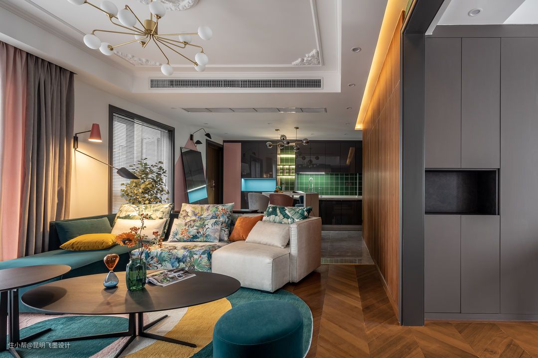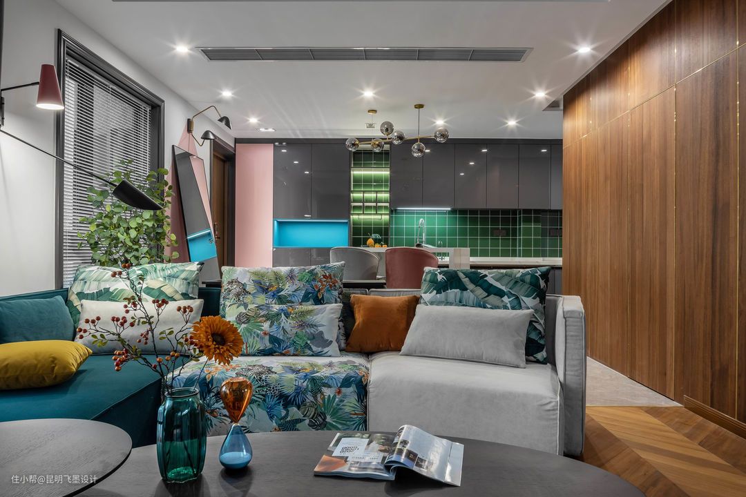 “感受温柔,领略山河。” ——我为两件事来到这世上,一是为了感受温柔,二是为了领略山河。 设计思路: 由于本案屋主独居,热爱绘画,希望打造一个既有温度又多彩的生活空间,本案整体的配色灵感来自屋主喜爱的西班牙画家Guim Tio的绘画作品。通过多种色彩的运用,表达屋主对家的理解:艺术性+自然性的和谐融合,希望与家在一起时,能保持温暖和舒适的状态,平淡的小烟火,才是最深的温柔。 整个空间我们运用了多种色彩,这加大了色彩的使用难度。想要通过这个空间的色彩来表达屋主对家和生活的理解,引用屋主的原话:“我内心天马行空,我的外壳五彩斑斓,愿你能透过层层保护色,看到最真实的我。”整体在墙面用色和材料颜色选择上,我们选择了代表自然属性的绿和蓝;和代表温暖属性的橙和粉。配色方法主要采用了邻近色配色和冲突色配色手法,让空间色彩和谐流畅,又起到醒目强调的作用。