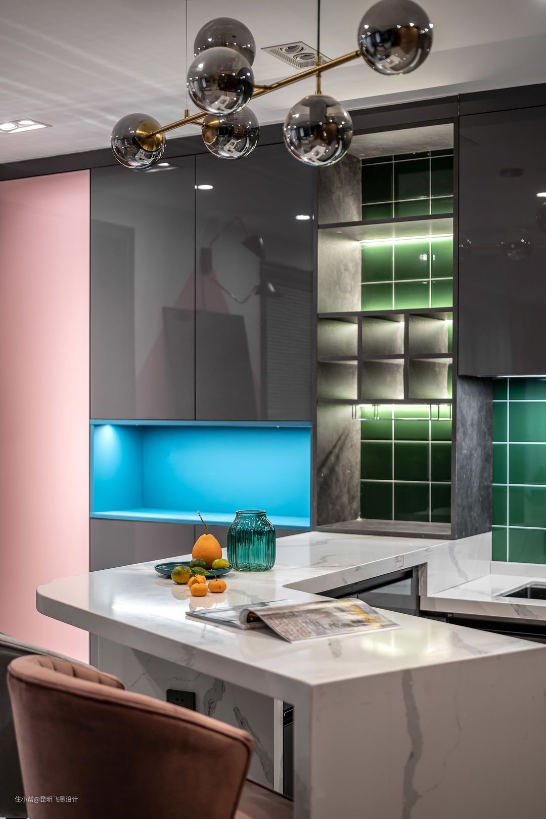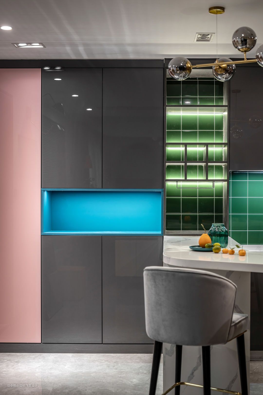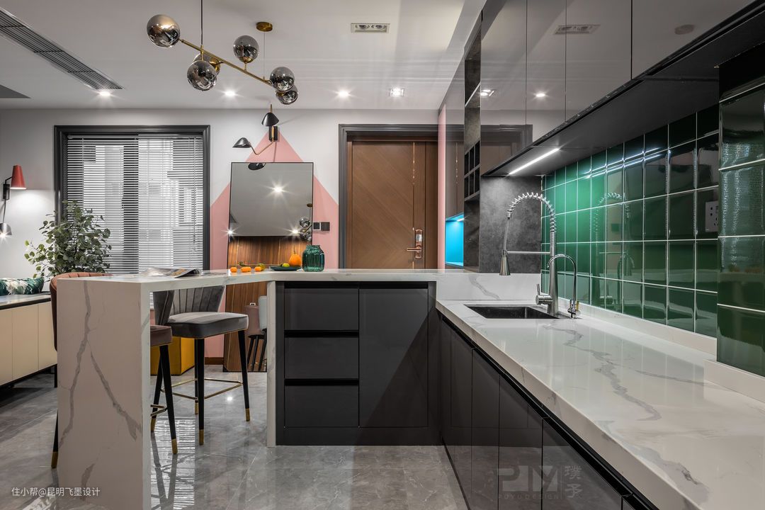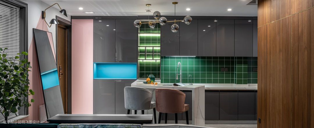 开放式厨房空间 这个空间是整个公共空间采光最差的区域,我们通过点光源和线光源的局部打造,让这个空间层次分明,而色彩上我们运用了:白色,灰色,粉色,蓝色,墨绿色多种色彩的碰撞,让这个暗的空间显得更有趣,也给整个家定了基调。