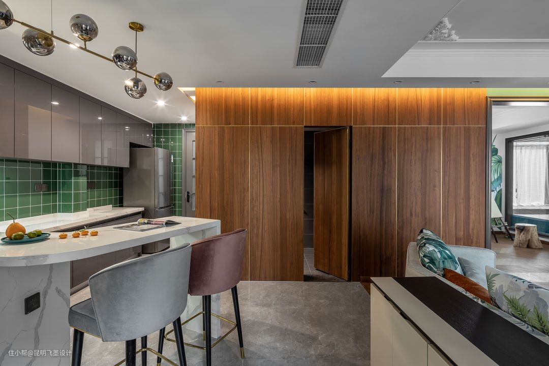 厨房橱柜与吧台连为一体,虽高低交错,但台面的岩板纹路却贯穿始终。