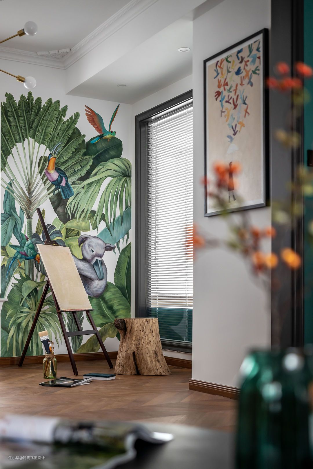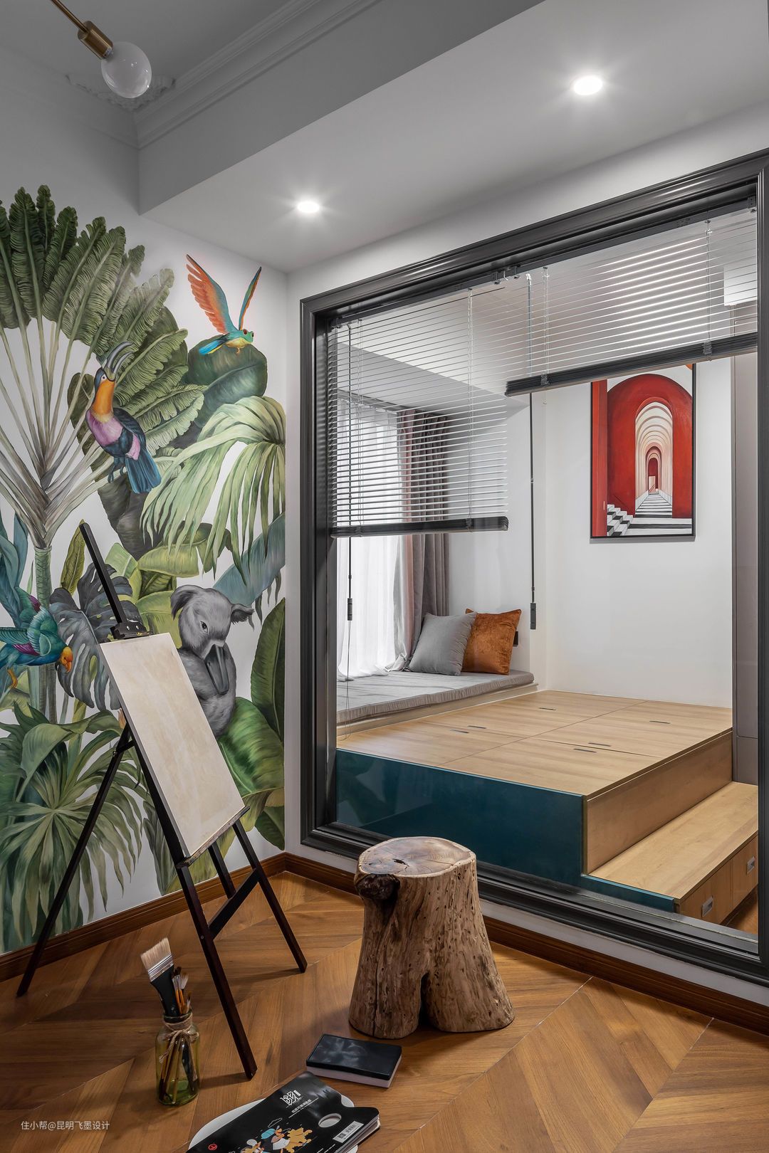 画室空间沿用客厅的自然属性为主,森林系的壁画,坐在老料的木凳上绘画,犹如在森林户外创作,别有一番趣味。