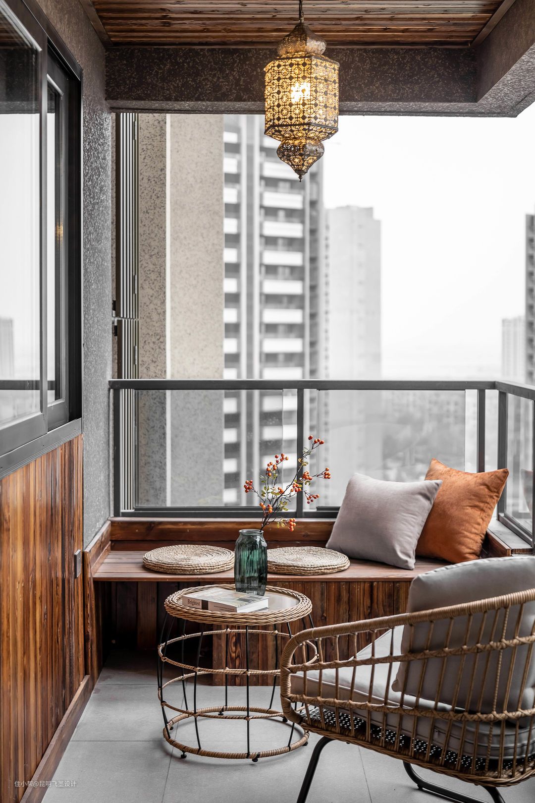 阳台空间 这个空间我们没有选择把它包在客厅内,想留有一处与外界相处的地方。用防腐木做了卡座,选择了复古的吊灯,当阳光明媚时,这里也是不同的风景。