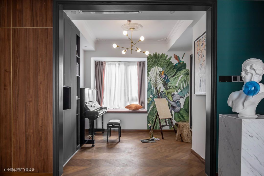 书房空间 书房也是琴房,敞开的空间把书房的光线借进客厅,客厅光线更敞亮,气流更流畅。书房墙面的壁画,我们和画师多次沟通比例和色调,经过画师整整2天的时间完成。画凳我们是淘的老料木凳。