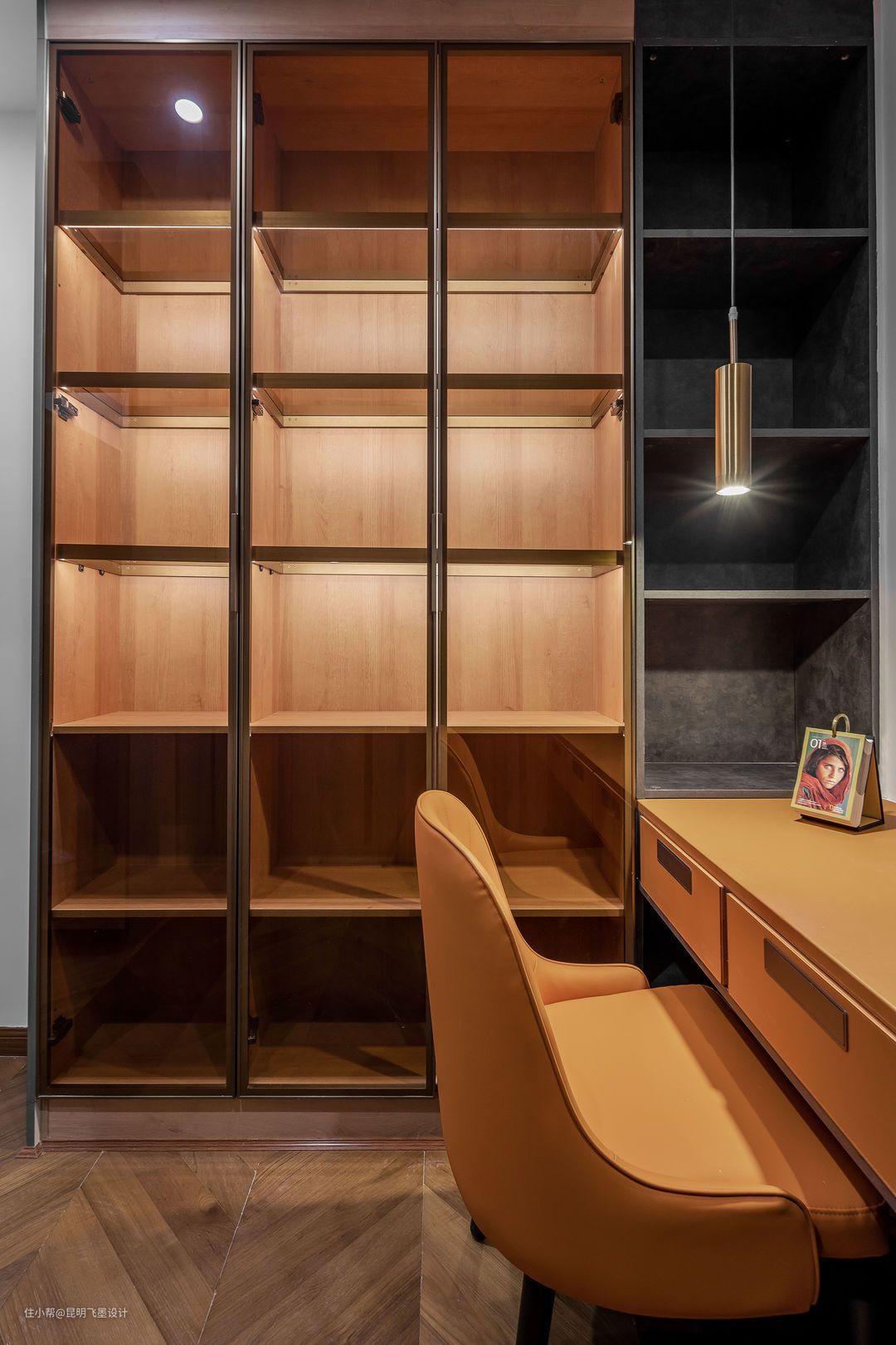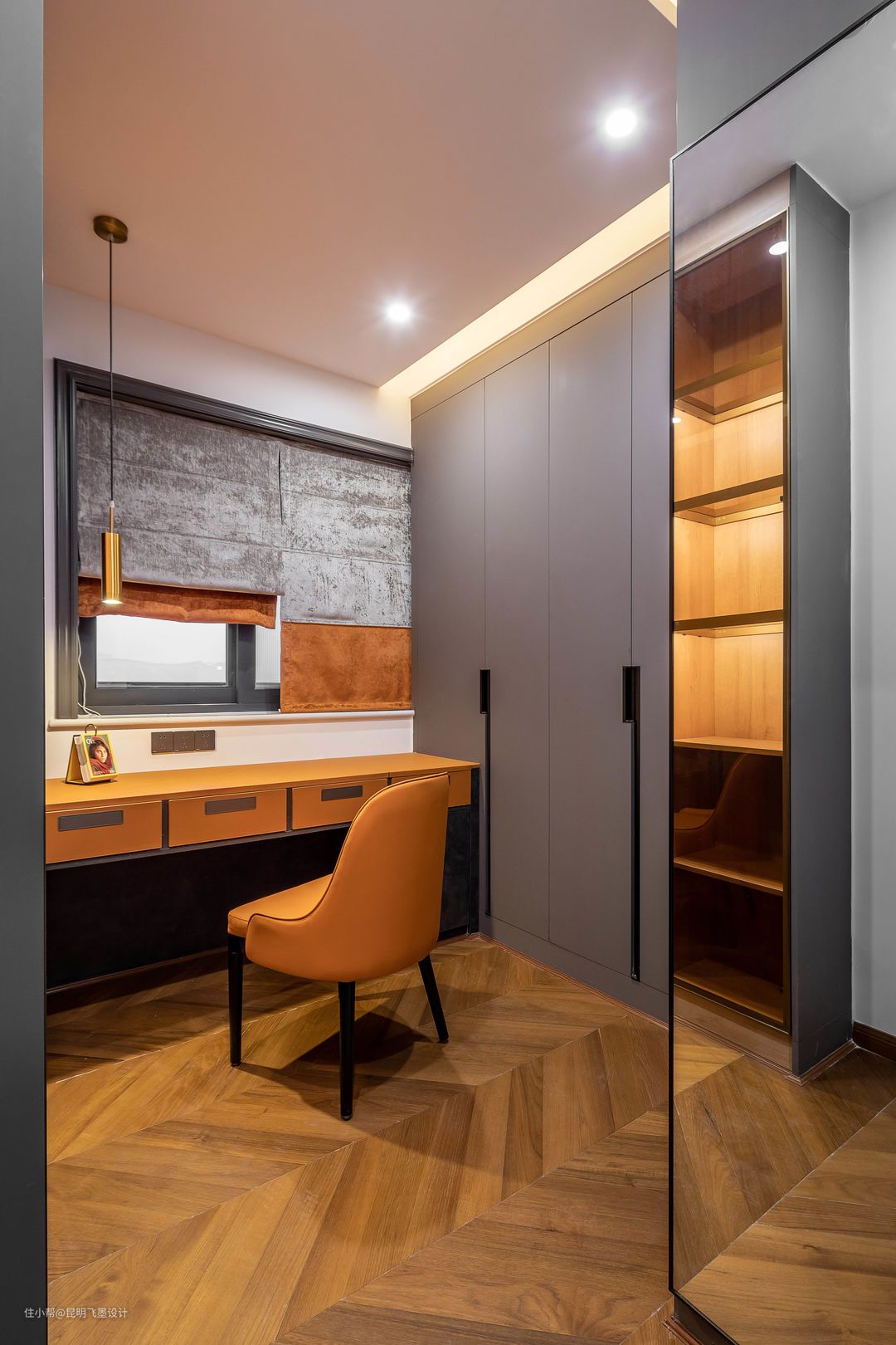 衣帽间空间 整体定制均采用隐形拉手,让整体空间更简洁,灯光沿用主卧了的灯光设计手法,颜色增添了一抹橙色,让这个干净的空间,又有了一丝温暖。