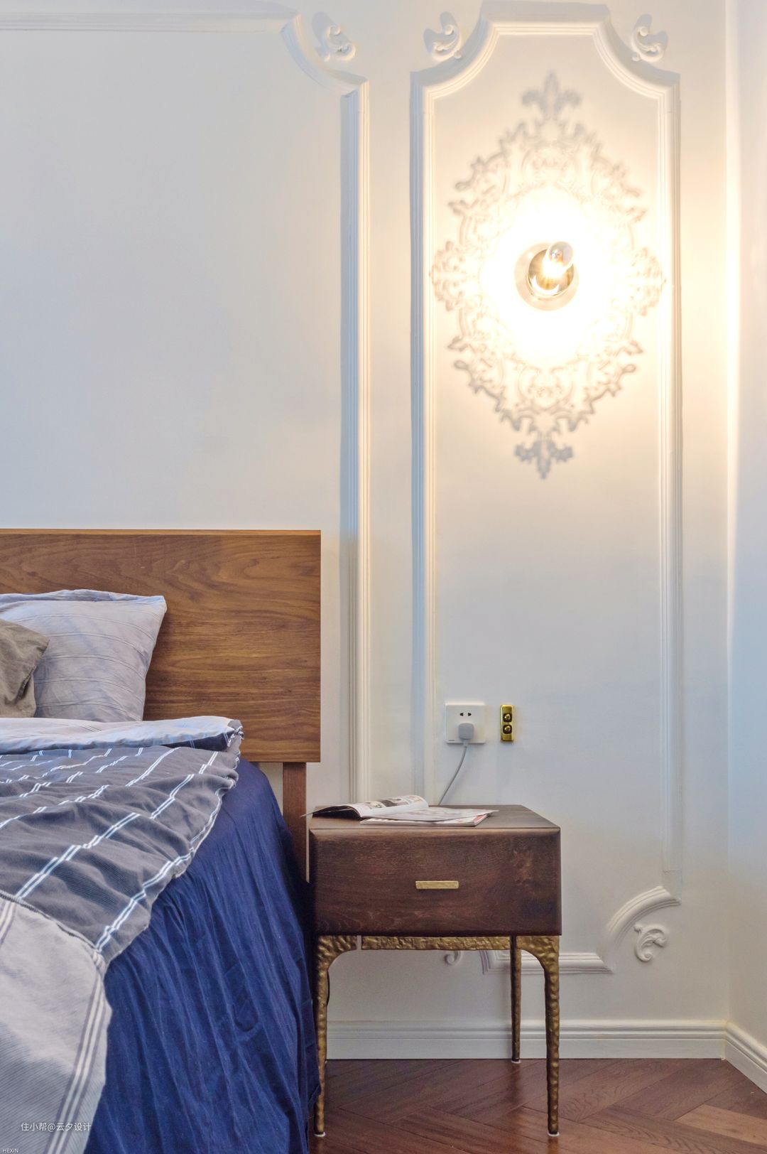 复古的床头开关,要注意用专用开关的底盒。墙面定制的实木线条表面刷的乳胶漆,要刷油漆的土豪请随意,灯具是设计师的灯,北欧表情的床头柜