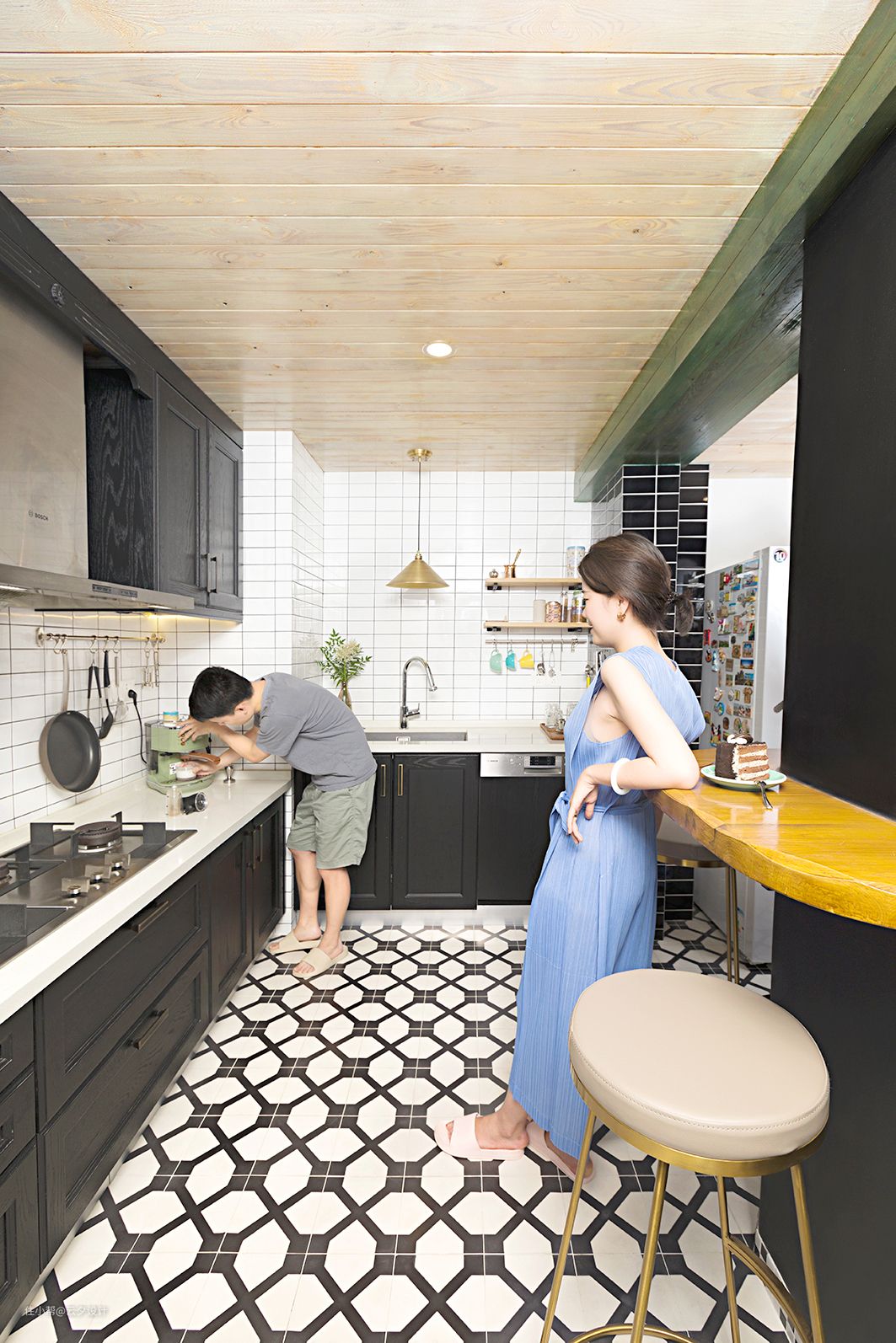 厨房这里主要考虑的是休闲厨房,橱柜高低错层根据使用者的身高调整使用更加方便,大量的黑白色和格子的图案,顶部用了复古白的木头,然后用绿色的木头让厨房的颜色不沉闷。金色的吧椅增加空间的质感。顶部户外木拼接,手刷白色木蜡油(强烈建议自己刷,不然师傅会给你刷的很均匀),手刷绿色木蜡油,为了颜色特殊某宝购买的木蜡油。墙面砖用了白色的地砖,因为地面用了花砖,墙砖就没有错缝贴,会显得稍微规矩一点。水槽旁的隔板是实木定制的。