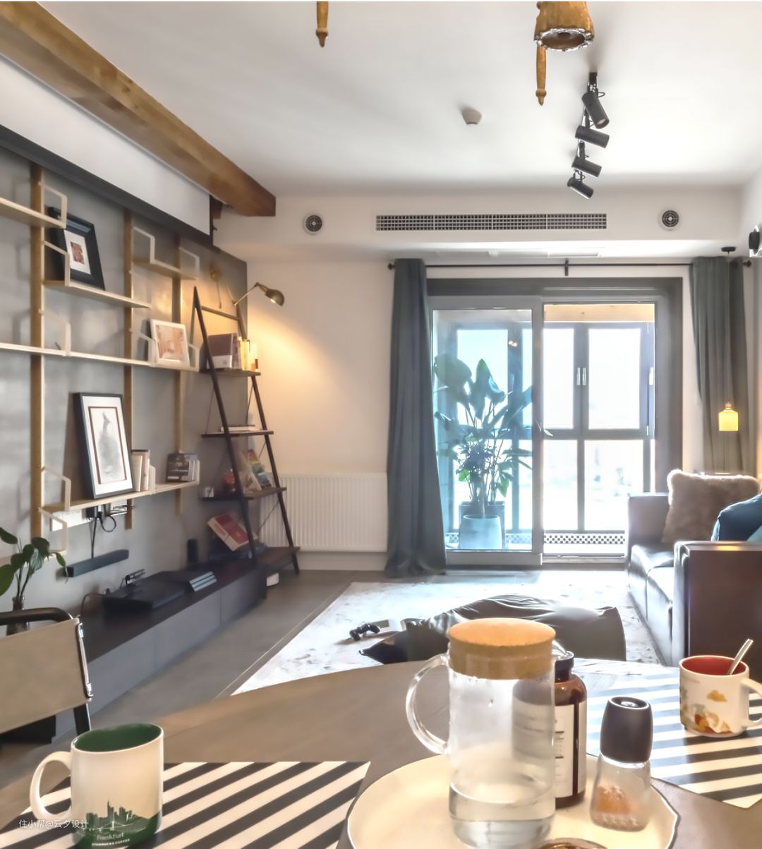 客厅没有买单人沙发用了地毯和懒人椅,体现更随性自由的生活。层高很矮,没有用吊顶和吊灯,用辅助光源的轨道灯作为主光源,整个客厅的格调主要以软装为主,风管机旁边是新风口,沙发背后的吊顶也是塞满了管道。