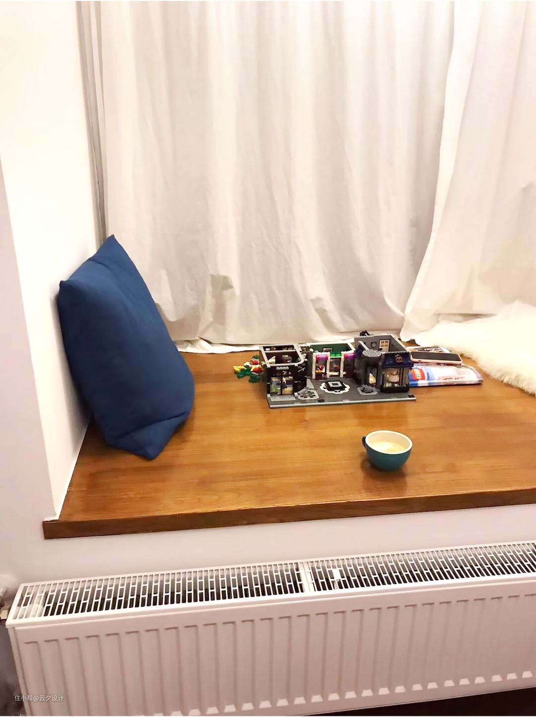 入住一年后…… 大飘窗用大块的木板做成一个休闲的游戏区,已经成了家里闲适的时候必不可少的区域。