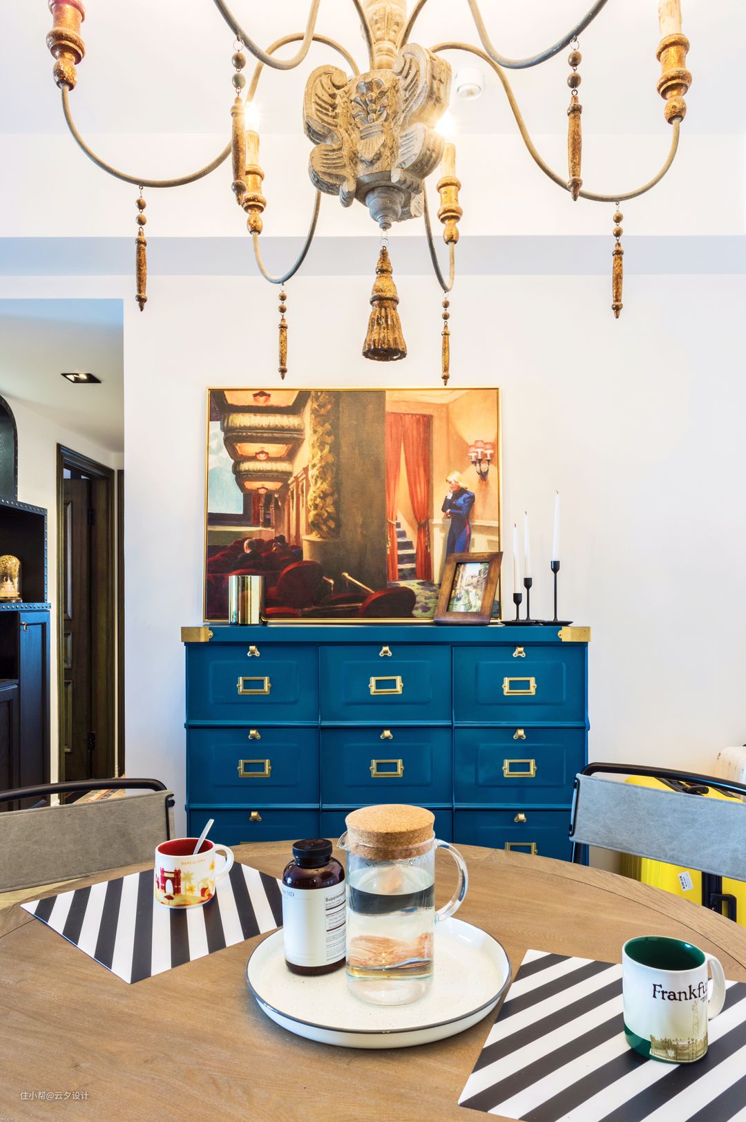硬装部分的设计主要是以黑白色为主,软装时选用复古的蓝色,加上原木色的桌面,体现更自然的感受。(美国自由画家霍普的作品)飞机头家购买的铁皮斗柜。 然后搭配蓝色裙子的挂画,来丰富餐厅白色的主色调。 (对,超级爱霍普的作品,每一个都爱。)