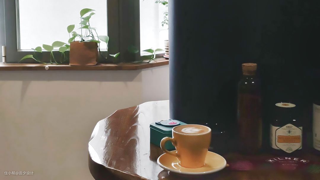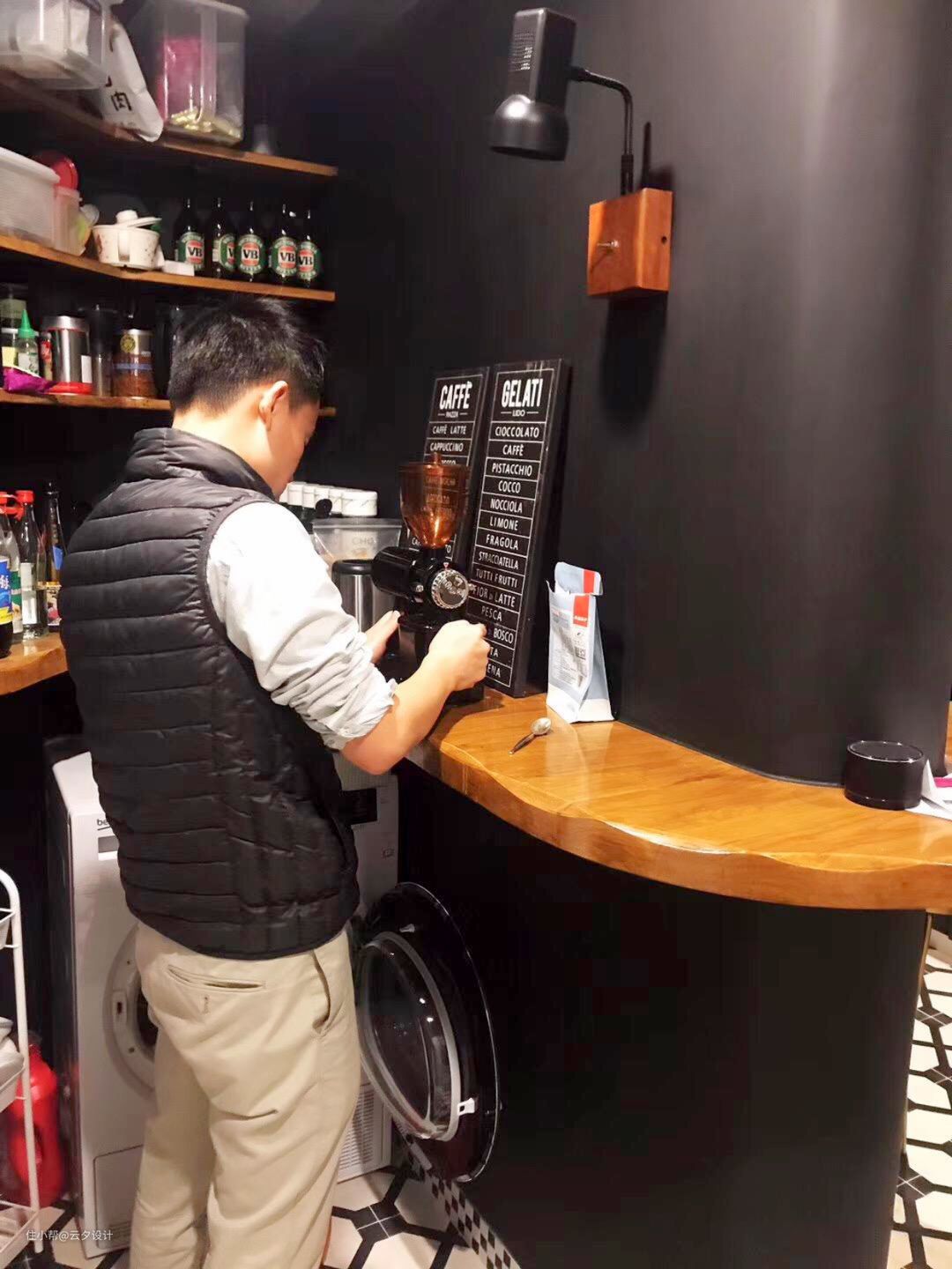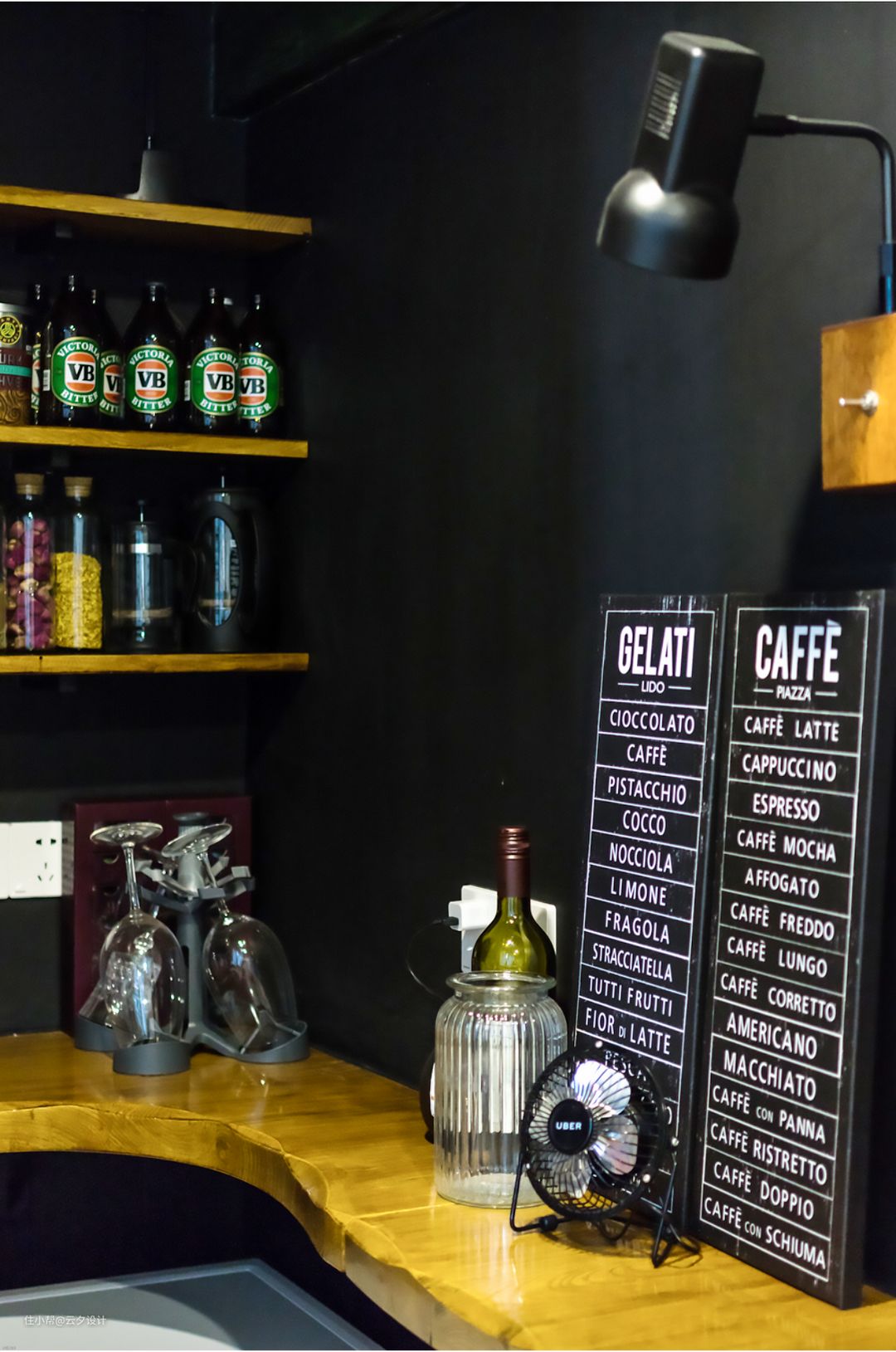 厨房里面的咖啡一角,休闲式厨房,也是用定制的原木隔板,旁边柜子隐藏的煤气表,燃烧热水器等……黑板墙的壁灯一定要选暖光哦,逼格满的不行。#吧台