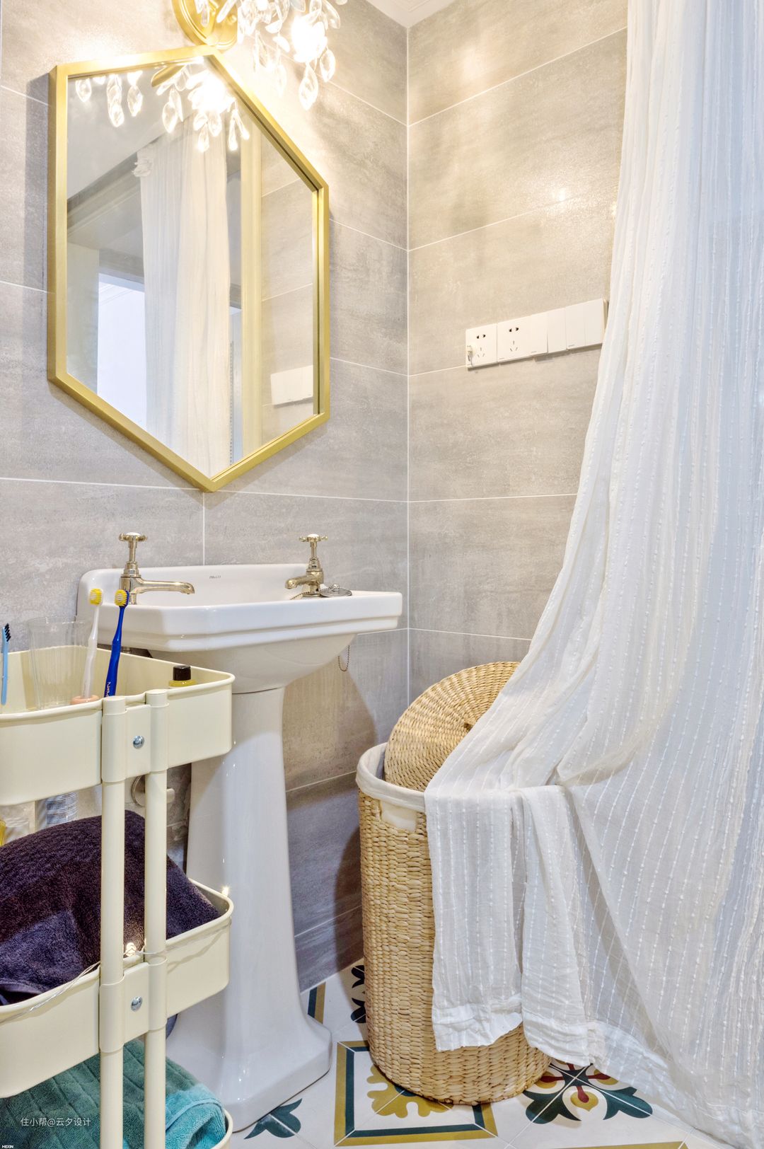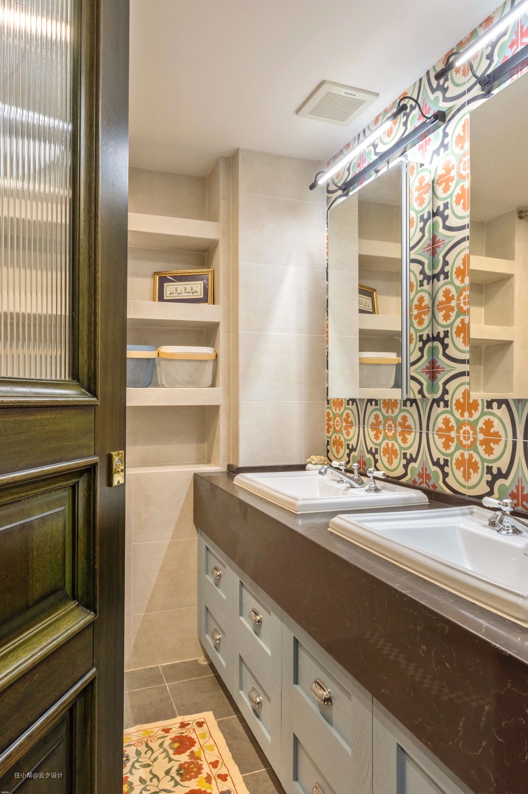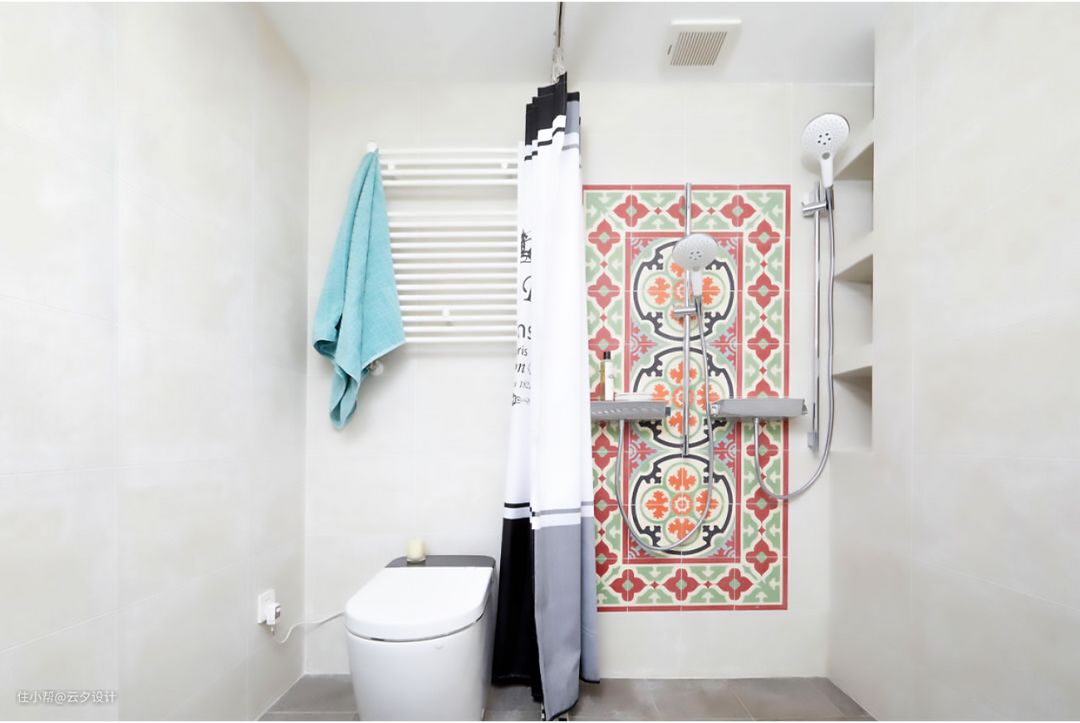作品的主题叫做陪伴,自然少不了双台盆,避免开了早晨的兵荒马乱。卫生间的门用的长虹玻璃,卫生间的锁有情怀的朋友都认识。浴室柜是定做,后面隐藏的是暖气的分水器,异域风情的花砖增加小空间的趣味。