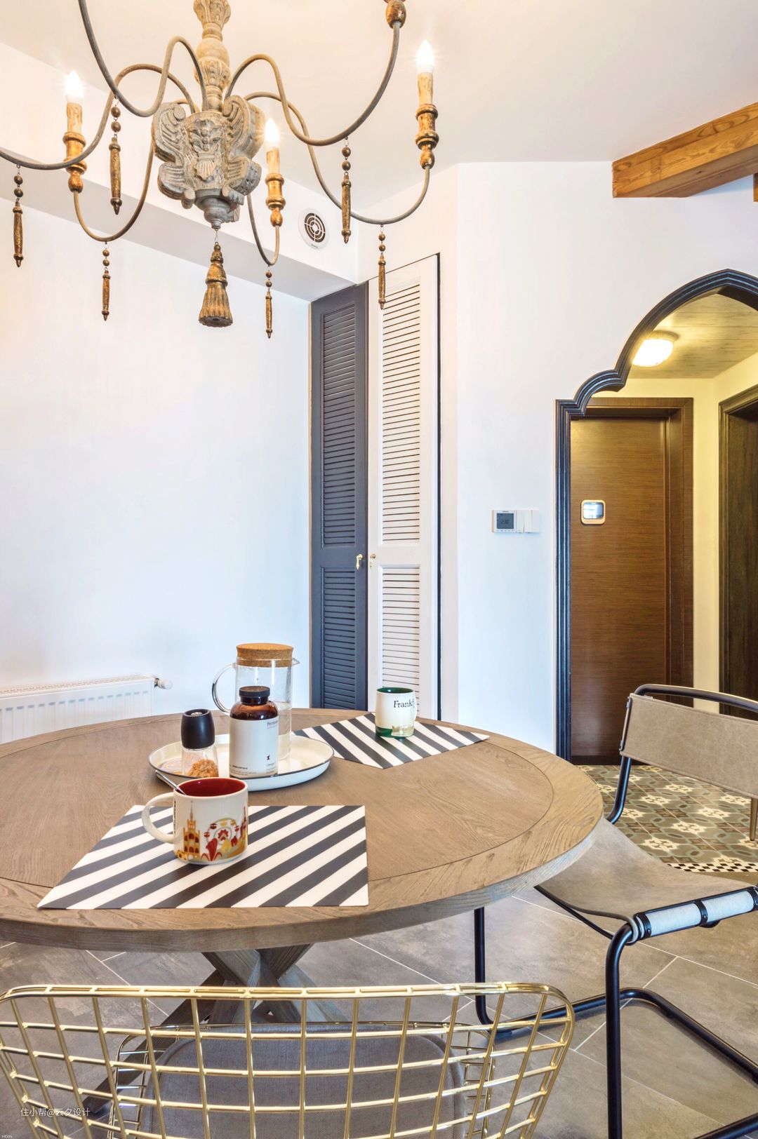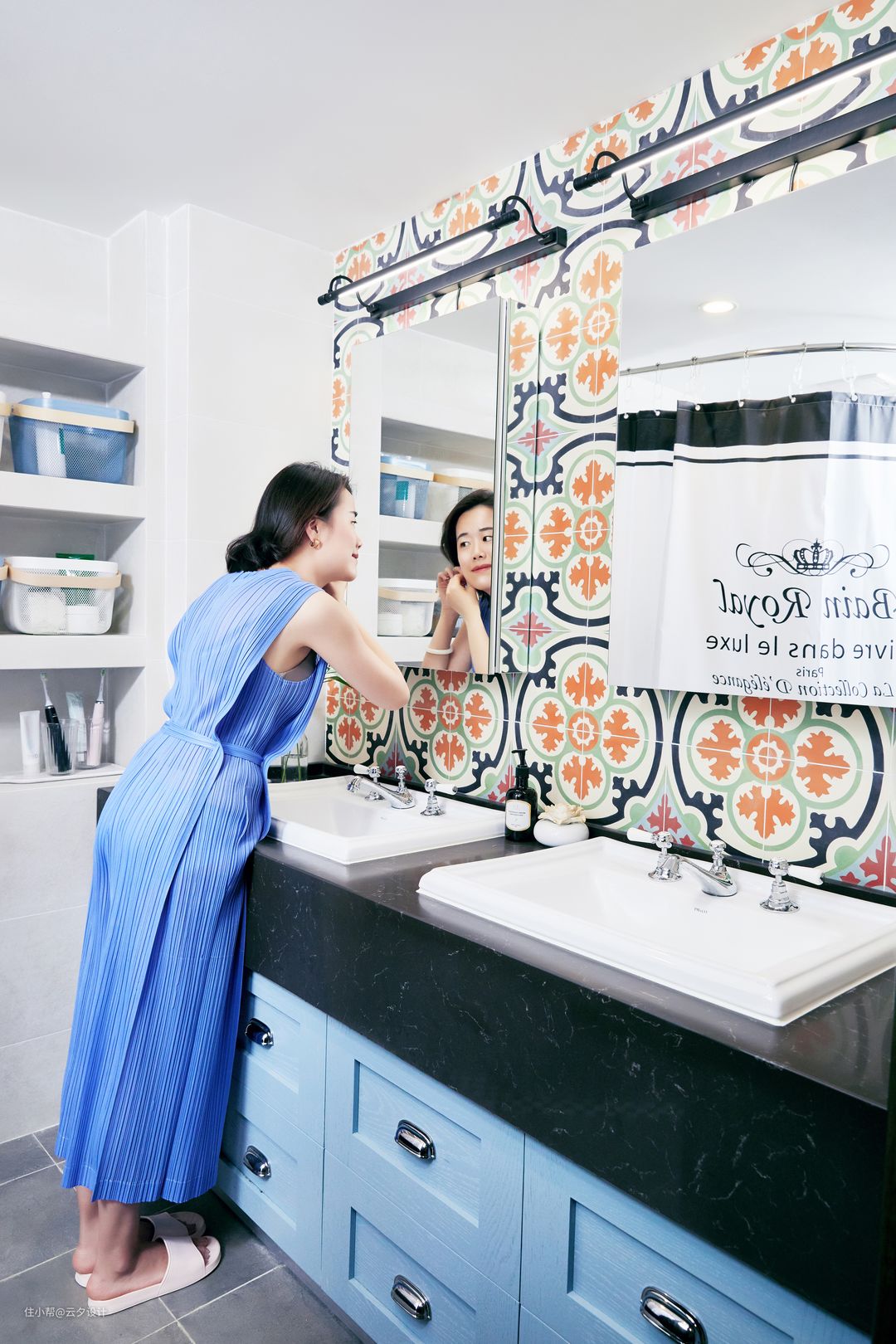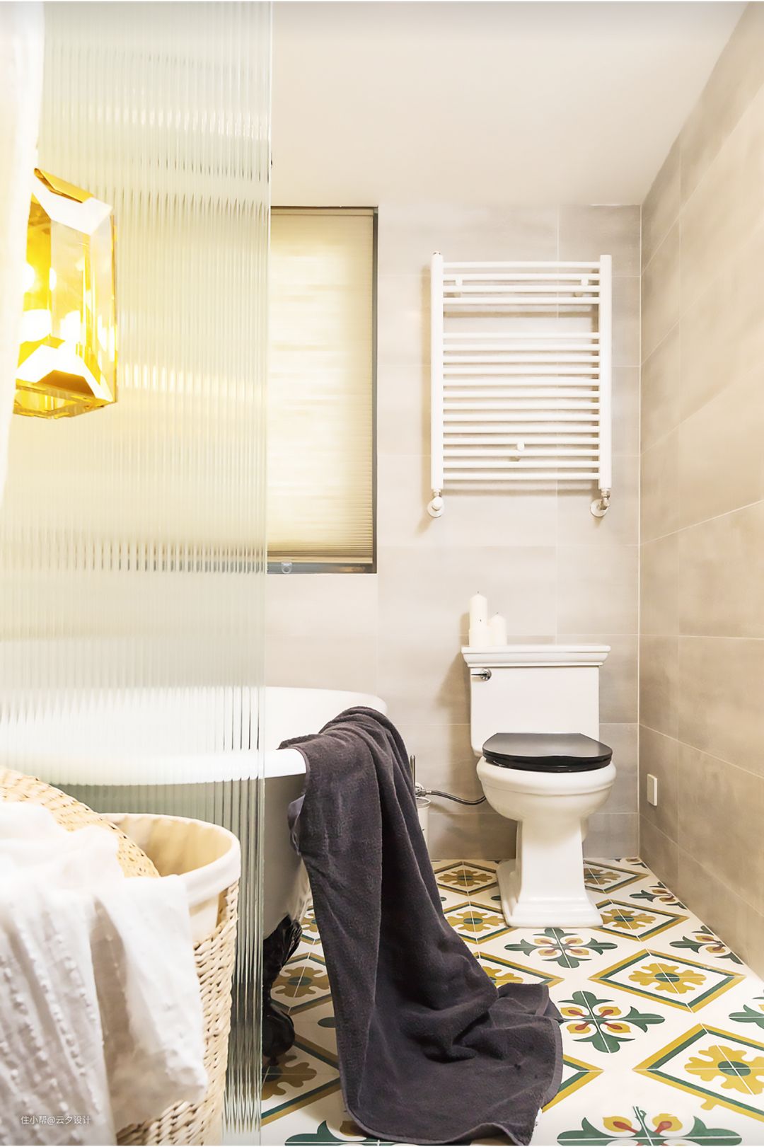 作品的主题叫做陪伴,自然少不了双台盆,避免开了早晨的兵荒马乱。卫生间的门用的长虹玻璃,卫生间的锁有情怀的朋友都认识。浴室柜是定做,后面隐藏的是暖气的分水器,异域风情的花砖增加小空间的趣味。