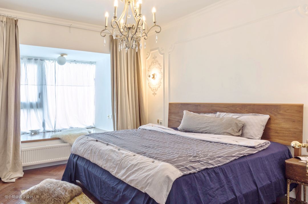 主卧的飘窗用了一大块木头,床头的背板也是一大块木头,满足实木情怀的业主。灯具是设计师的灯,主卧的床原木大板定制的2米宽的床。宜家的窗帘宜家的地毯。
