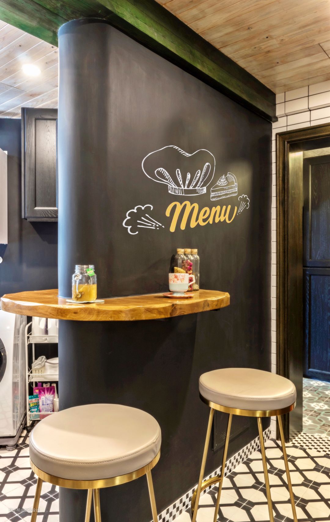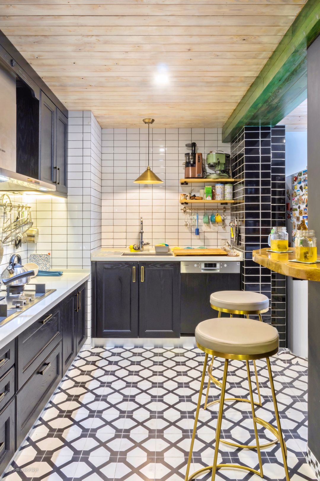 厨房这里主要考虑的是休闲厨房,橱柜高低错层根据使用者的身高调整使用更加方便,大量的黑白色和格子的图案,顶部用了复古白的木头,然后用绿色的木头让厨房的颜色不沉闷。金色的吧椅增加空间的质感。顶部户外木拼接,手刷白色木蜡油(强烈建议自己刷,不然师傅会给你刷的很均匀),手刷绿色木蜡油,为了颜色特殊某宝购买的木蜡油。墙面砖用了白色的地砖,因为地面用了花砖,墙砖就没有错缝贴,会显得稍微规矩一点。水槽旁的隔板是实木定制的。