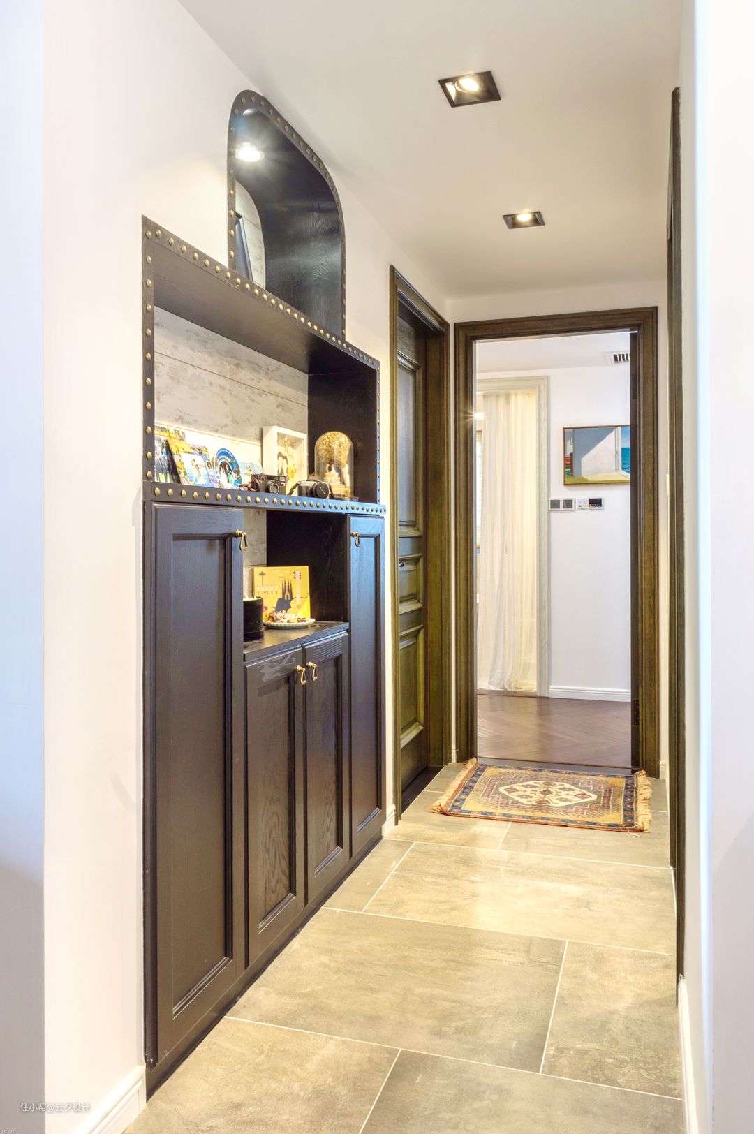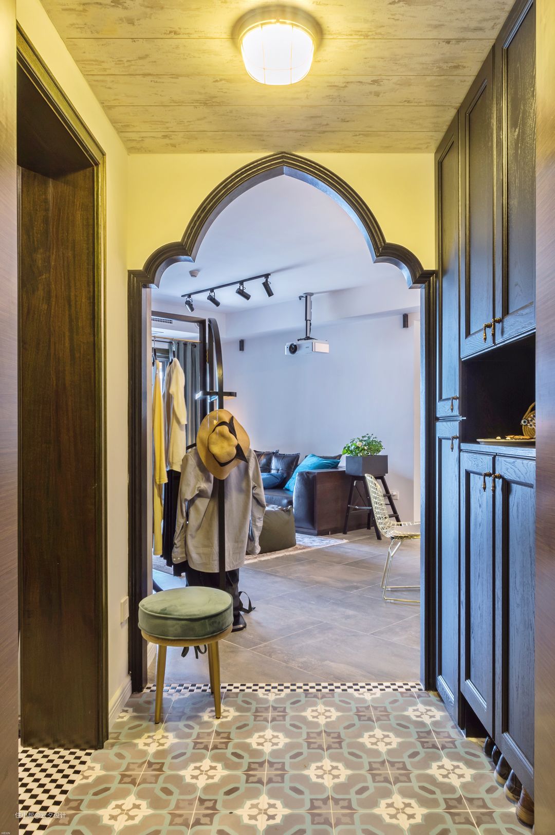 这里用了异域风情的瓷砖和门洞造型,让玄关更有趣味,更浪漫。 门口的花砖是见南花,水泥浇灌的,感觉脏东西会渗透进去,但是还是挺好看,这个门套造型师傅放样,然后寄到某宝卖家做的实木线条然后拿回来喷的黑色油漆。玄关顶部是复合地板,做旧的款式突出怀旧的风格。