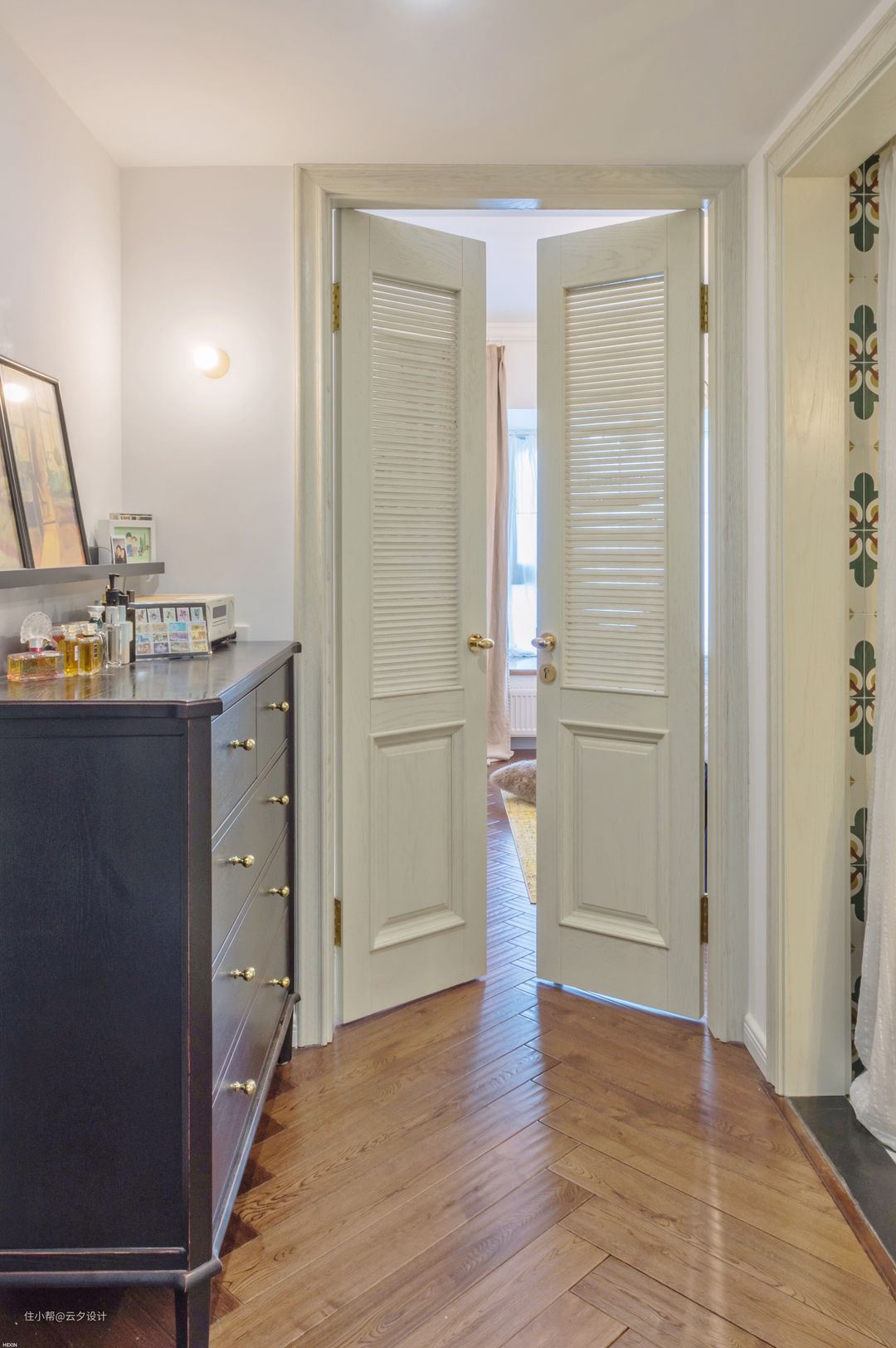 套房里面的卧室门做的双百叶,适当隔开了衣帽间区域。外面和卫生间对着的是个斗柜,当梳妆台用,顶部的辅助光源满足不了梳妆的要求,一个小灯既有逼格又实用。