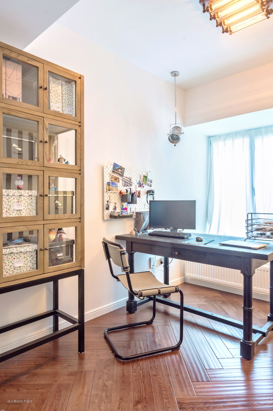 洞洞板让书桌的收纳都在墙上。北欧表情的书柜,因为顶部是新风管道,刚好这个书柜高度复合标准。