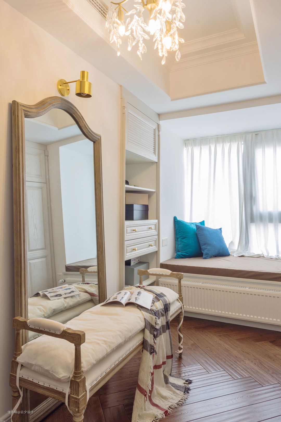 上面百叶的柜门里面是新风的回风口和检修口,下面的柜体做的无门柜体,放包包用,大白墙放了一个超大穿衣镜,显得衣帽间更宽,背后是一整排大衣柜。#衣帽间