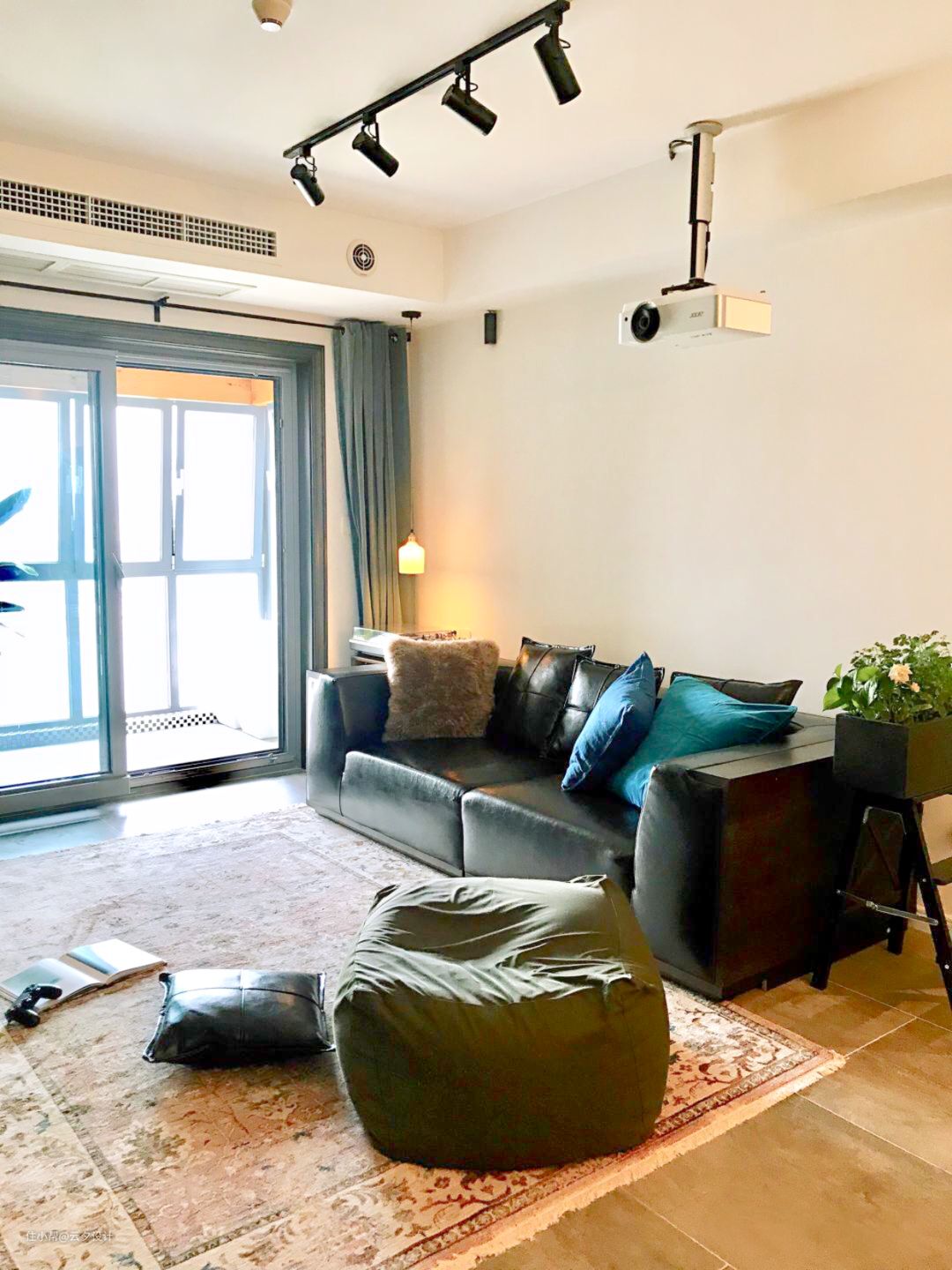客厅没有买单人沙发用了地毯和懒人椅,体现更随性自由的生活。层高很矮,没有用吊顶和吊灯,用辅助光源的轨道灯作为主光源,整个客厅的格调主要以软装为主,风管机旁边是新风口,沙发背后的吊顶也是塞满了管道。