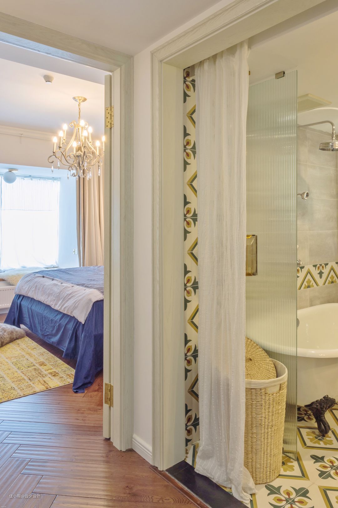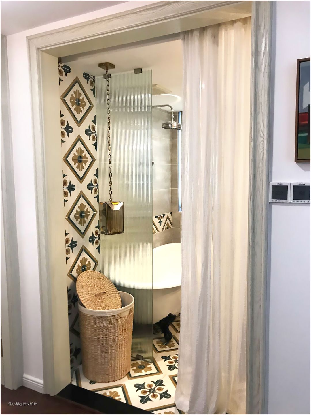 浴缸和脏衣篓用长虹玻璃(网红玻璃)做隔断。纱幔是宜家买的,有点缩水。吊灯设计师的灯