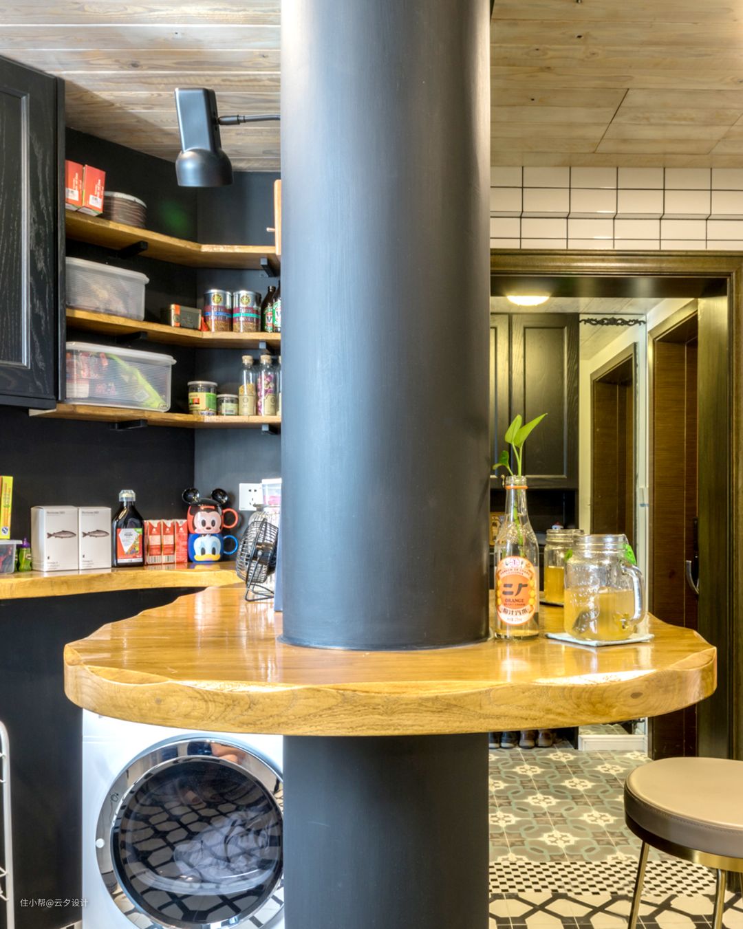 圆形的老榆木吧台在制作时要保证没有接缝的情况下,还需要寻找这个木头比较困难,吧台下方木头打孔与原来的承重墙固定,保证基本承重。黑板墙也是提升乐趣的一个方面。一个人做饭的时候,另一个人在吧台这里,也是一种陪伴。
