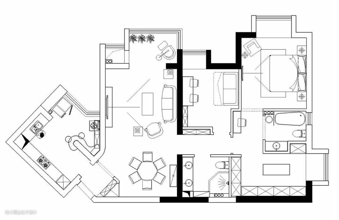 空间比较乱,餐厅区域比较浪费,客卫没有窗户,没有南北通透。