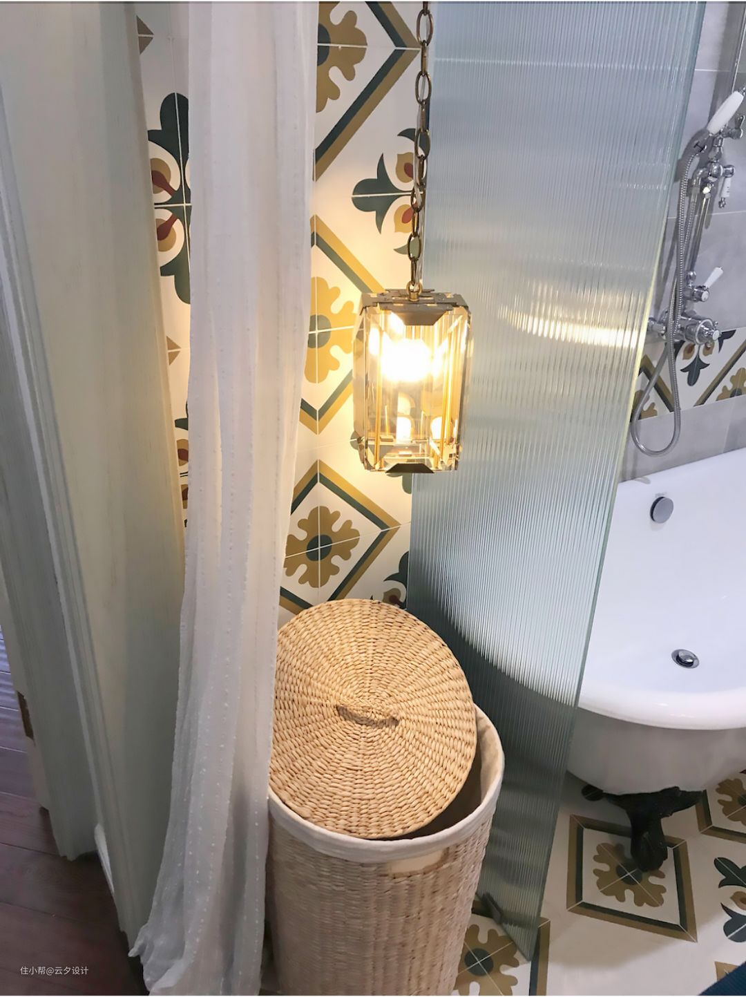浴缸和脏衣篓用长虹玻璃(网红玻璃)做隔断。纱幔是宜家买的,有点缩水。吊灯设计师的灯