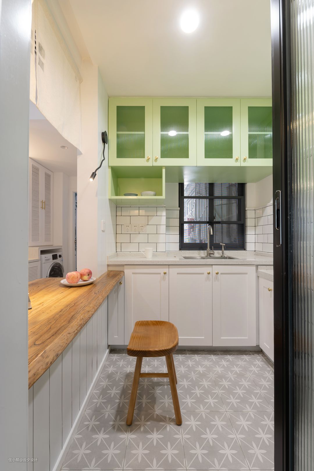 入户用了一个清新的绿色,与户外的陈旧形成对比,有眼前一亮的感觉,厨房与过道用鞋柜做隔断,半开放的厨房用长虹玻璃做的折叠门。