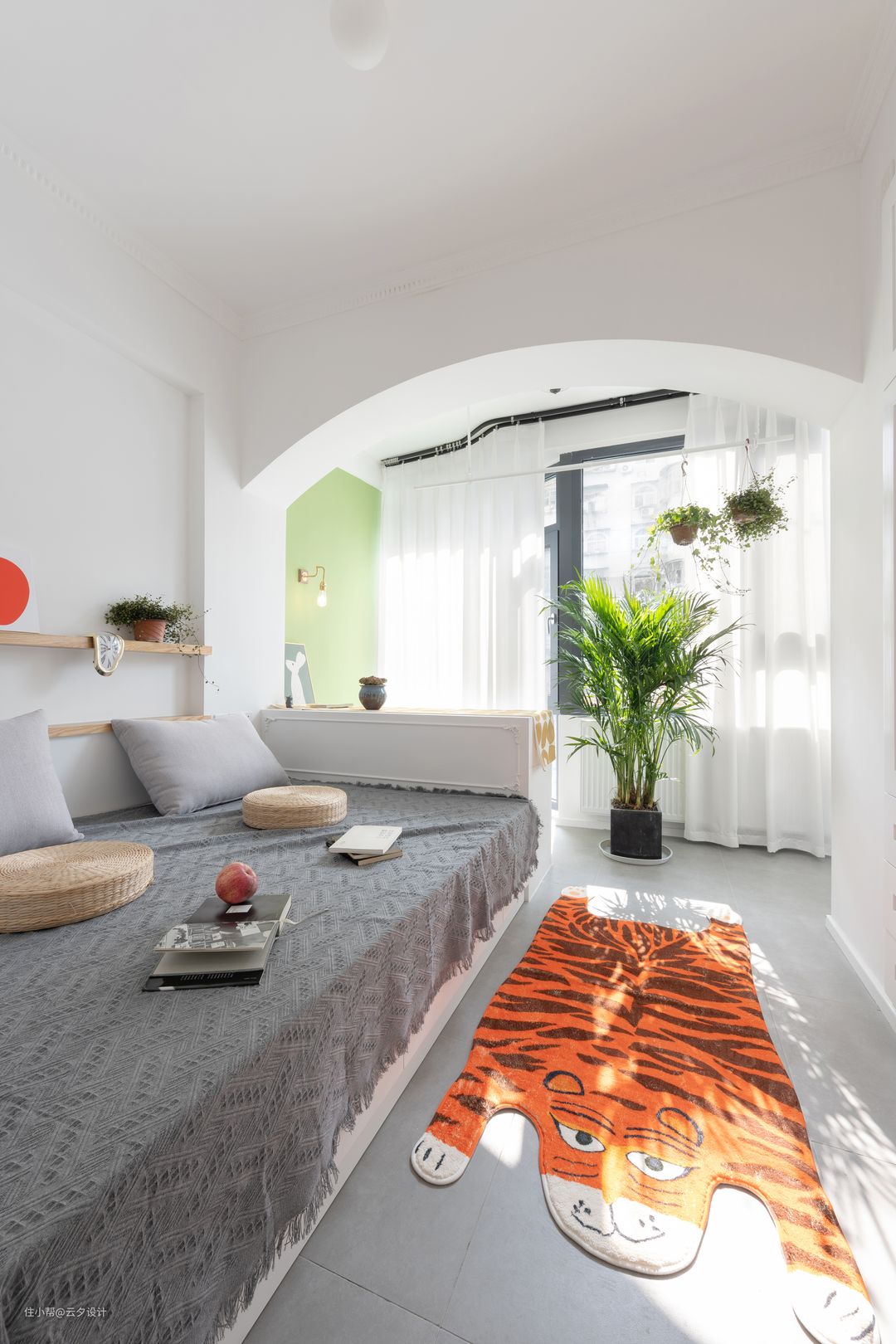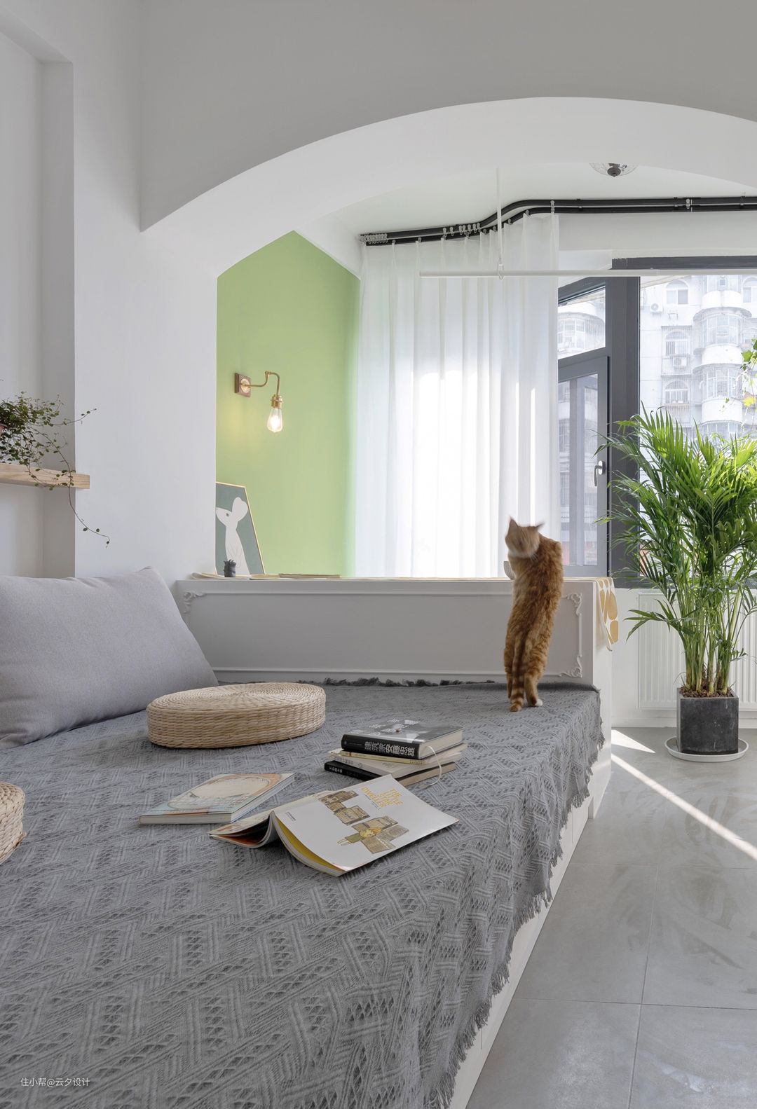 改造后:原有阳台的拱形是砖混结构的,无法拆除,我们把这里的拱形扩大,增加了卧室的视觉感。榻榻米后面是原来的阳台,榻榻米靠背是个80cm高的书桌,阳台的挂衣杆是普通杆,用来晾晒小件衣物。乳胶漆是多乐士的薄荷绿。