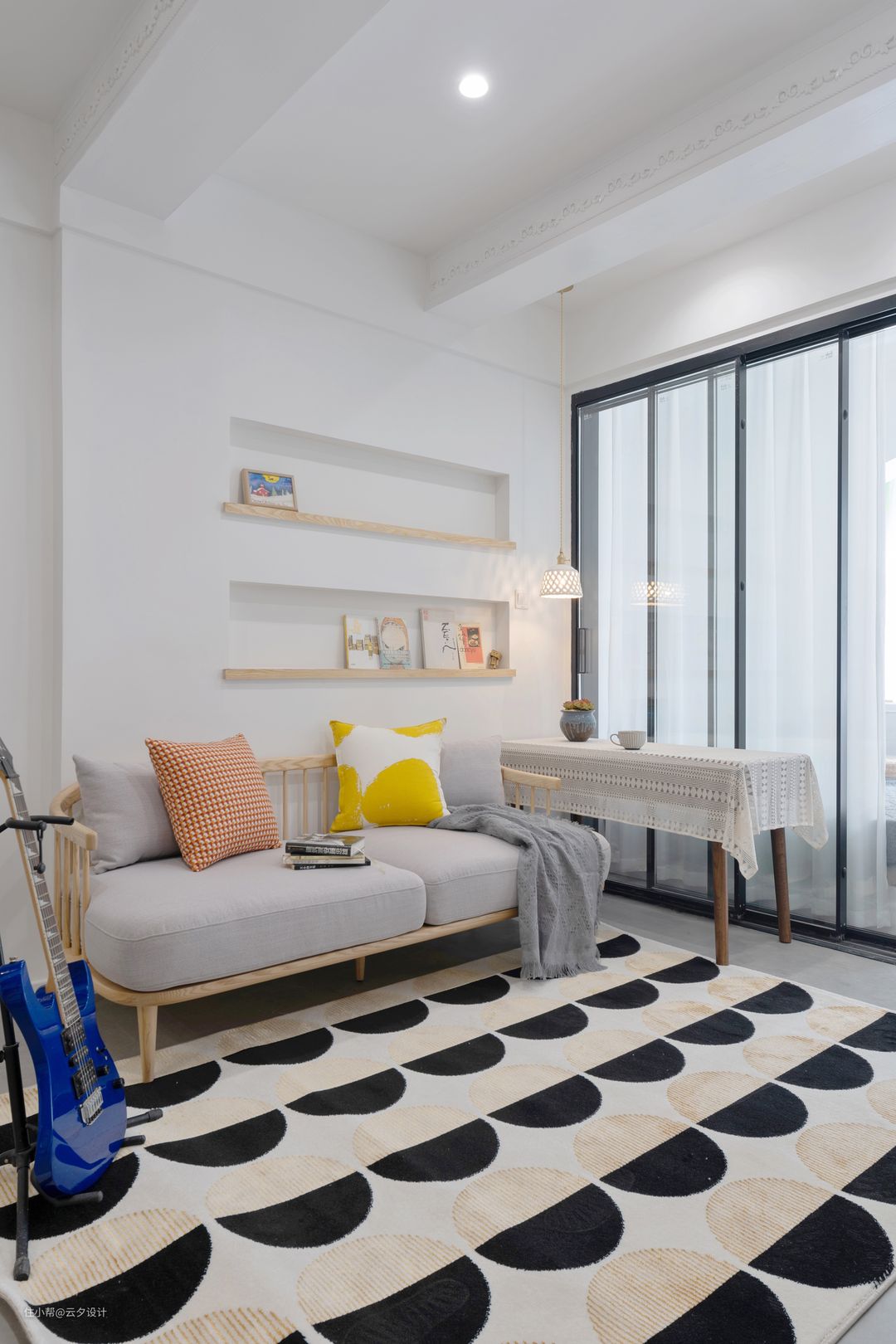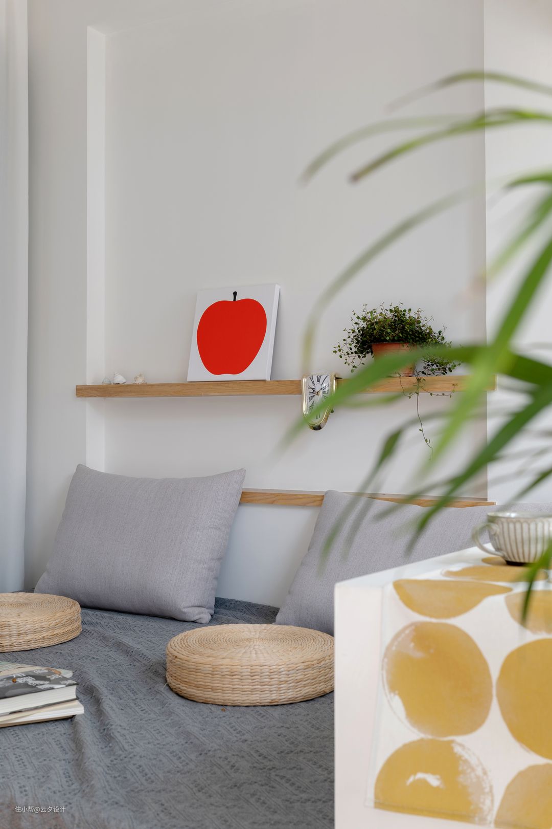 沙发后面有一个内嵌的尺寸,我把他封闭起来,做一个壁龛,用开放客厅的书物,客厅没有放茶几,旁边放了一个折叠的书桌,必要时抽出来当大桌子用。