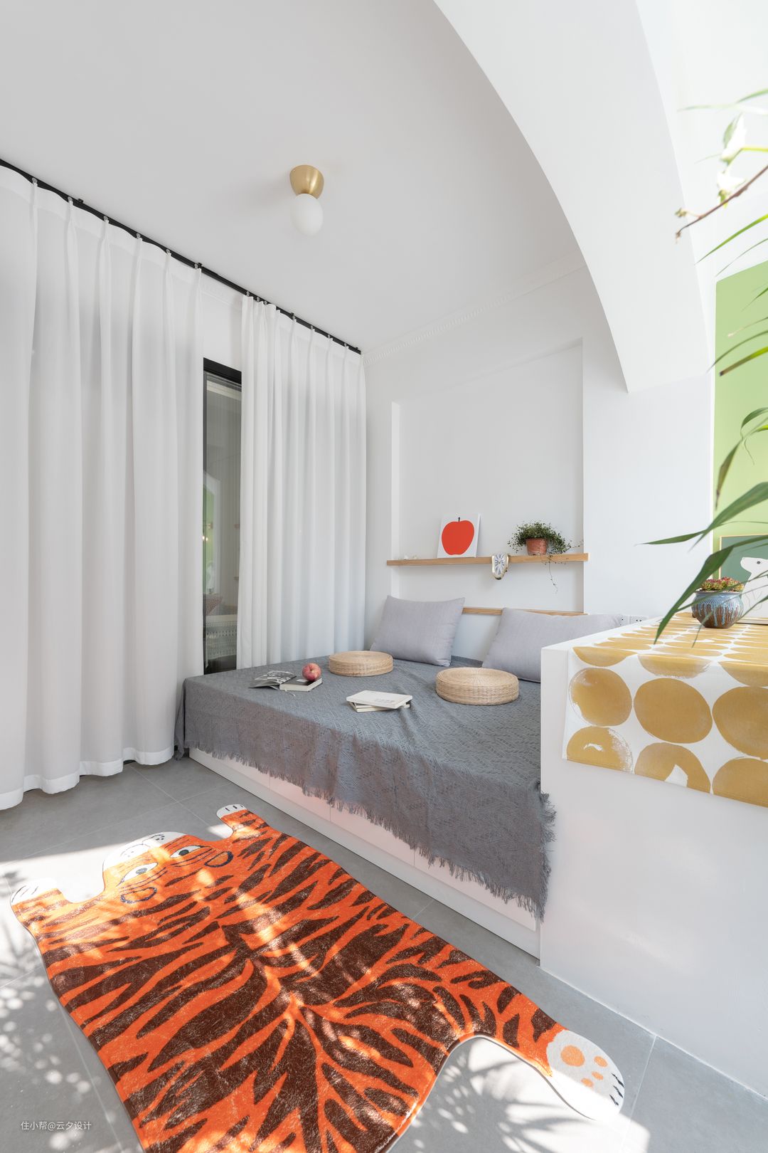 这里是和客厅挨着的儿童房,秉承着储物多的模式做了一个1.5米宽的榻榻米,和客厅之间做了一个玻璃缩门,在IKEA购买的纱帘,白天给客厅一些采光,因为房屋朝南,这里是客厅采光的重点区域,榻榻米的靠背连接着阳台的书桌。形成了一个功能性质的儿童房。