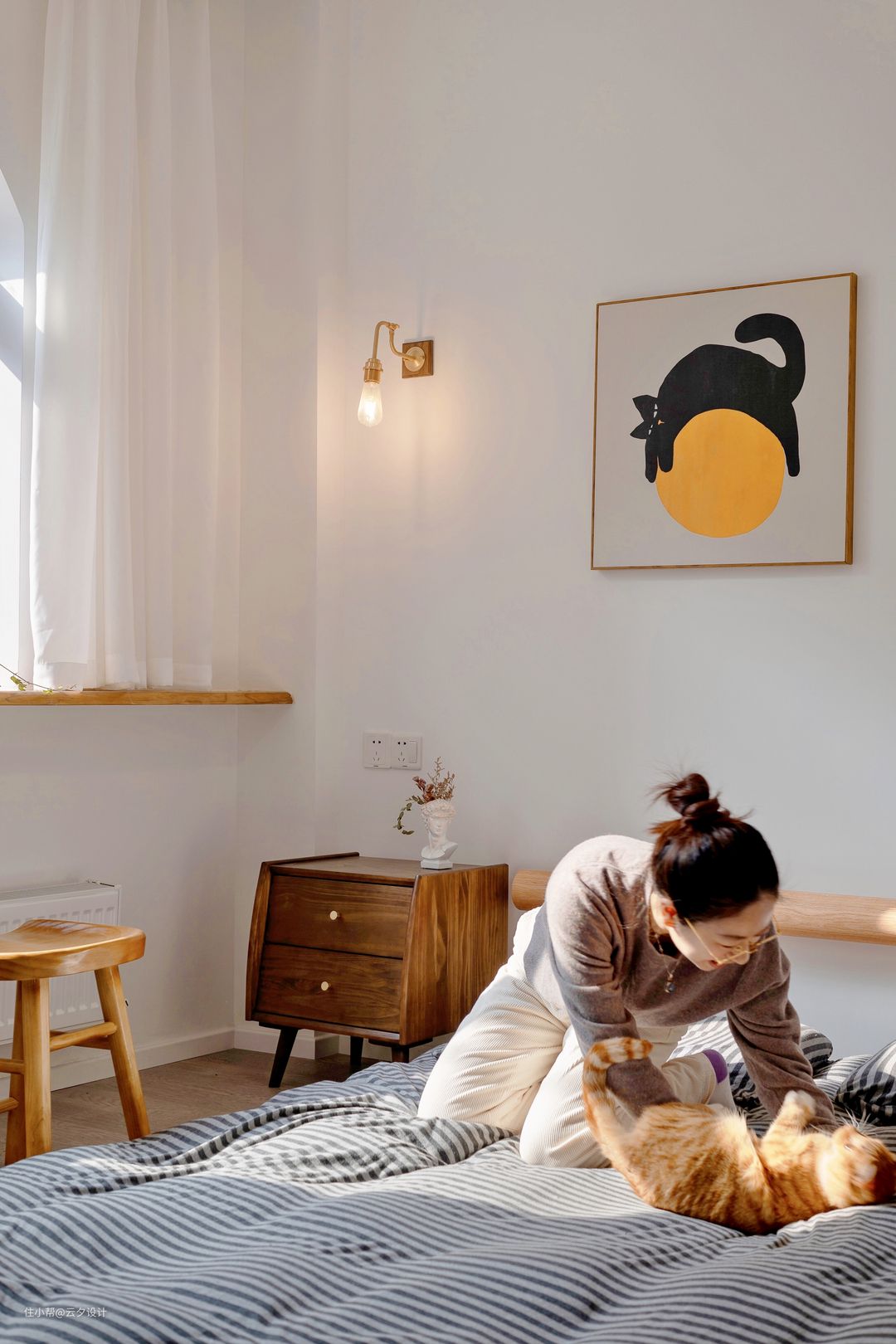 主卧是朝南的,光线非常好,为了不辜负这么好的朝向,我们把飘窗加宽,做成了一个悬挂式的书桌,也可以作为一个小型梳妆台,主卧的床做的是无脚落地床,这个是根据业主MM的生活习惯,后期可以调整。灯具也选择的是比较轻盈的灯,整体氛围都比较轻松的感觉。