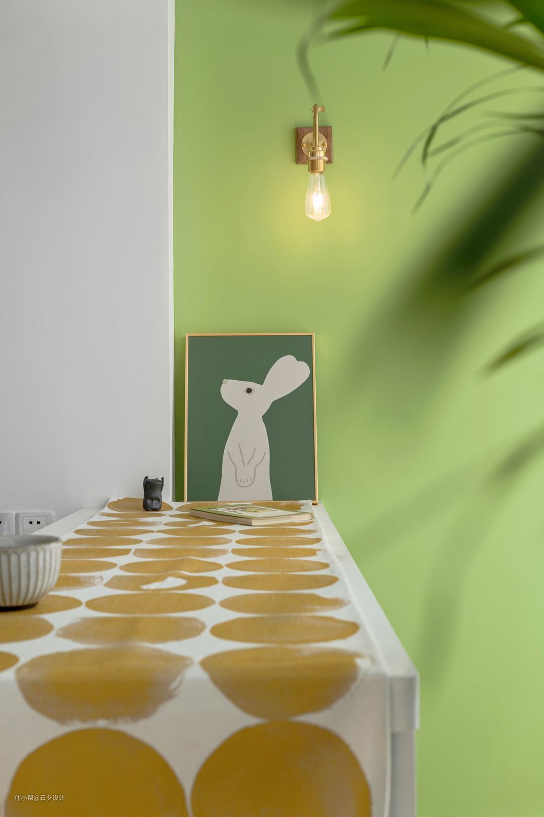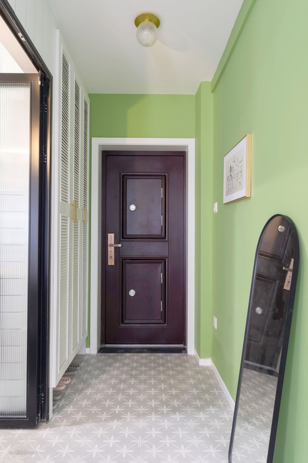 入户用了一个清新的绿色,与户外的陈旧形成对比,有眼前一亮的感觉,厨房与过道用鞋柜做隔断,半开放的厨房用长虹玻璃做的折叠门。