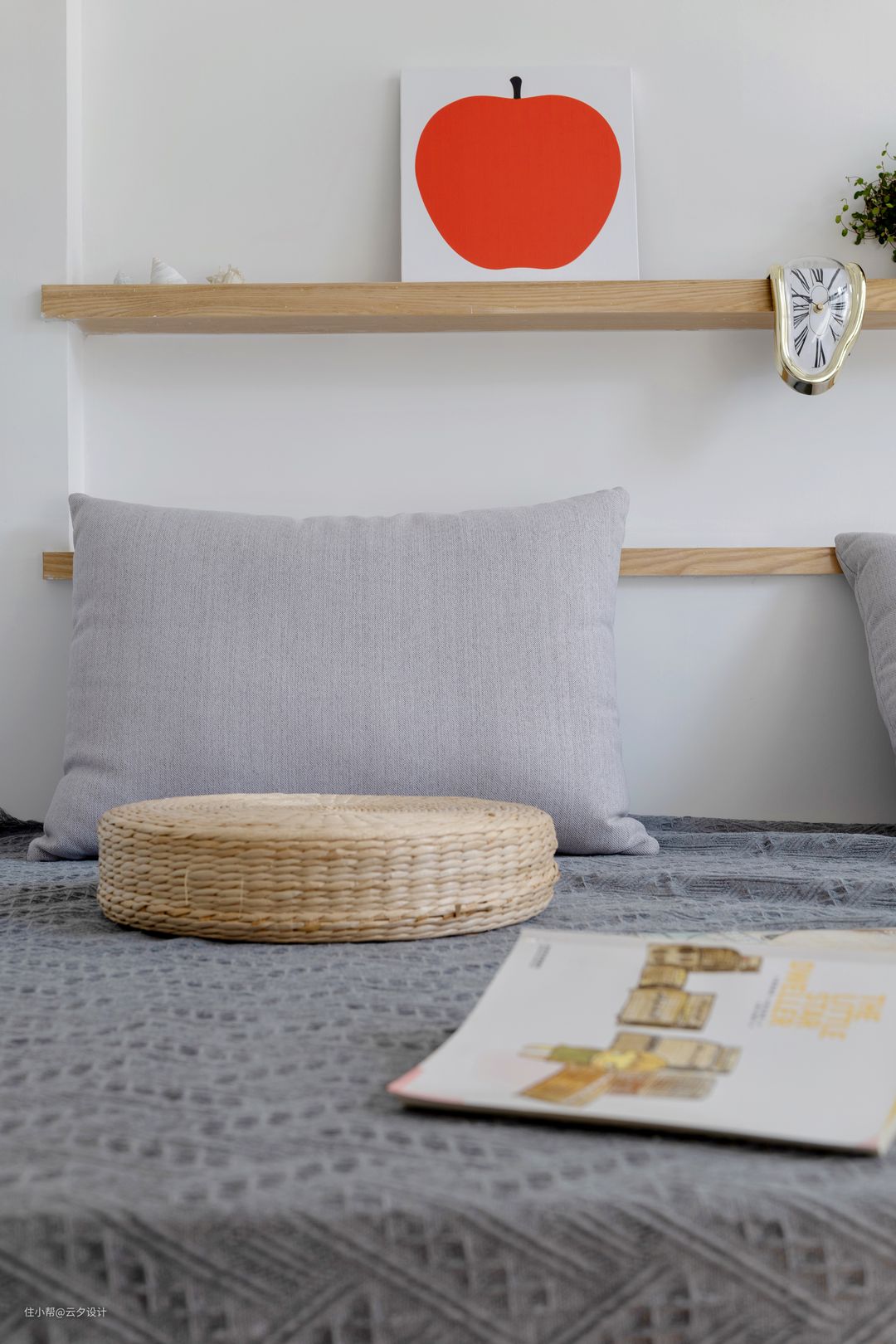 主卧是朝南的,光线非常好,为了不辜负这么好的朝向,我们把飘窗加宽,做成了一个悬挂式的书桌,也可以作为一个小型梳妆台,主卧的床做的是无脚落地床,这个是根据业主MM的生活习惯,后期可以调整。灯具也选择的是比较轻盈的灯,整体氛围都比较轻松的感觉。