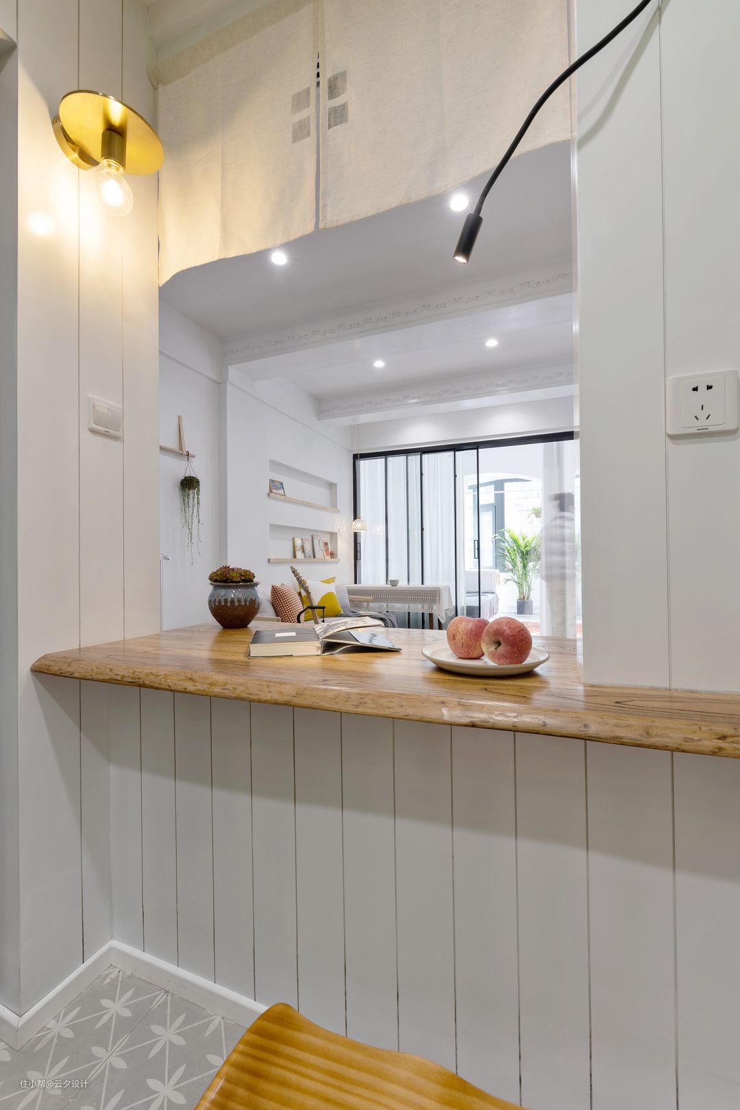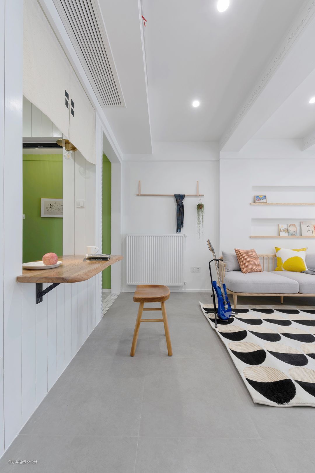 客厅的主色调白色为主,客厅占用了原有卧室的空间,原来入户的空间给了厨房,在厨房的墙面上开洞,用实木板定制了一个餐桌,满足一家三口的基本需求,因为厨房的使用空间不大,餐桌也可以当作吧台作为厨房的一个操作台面。