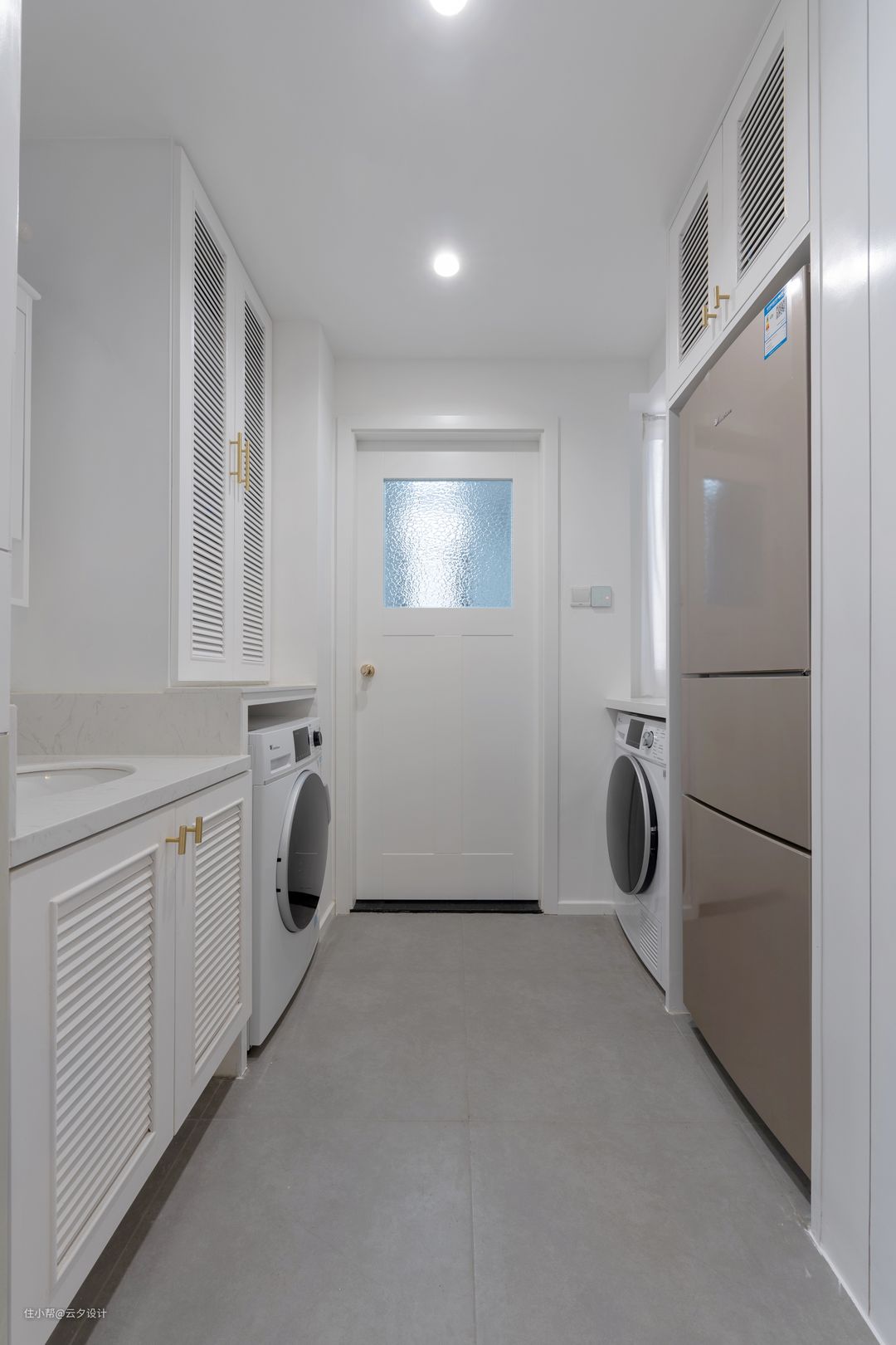 这个小小的走廊几乎满足了家里所有的重要电器,洗衣机在厕所门左边,和浴室柜一起,便于后期排水与检修,烘干机在门的右边,烘干机上面还有一个很大的台面,可以放脏衣篓,可以说是一个比较功能性的一个走廊。