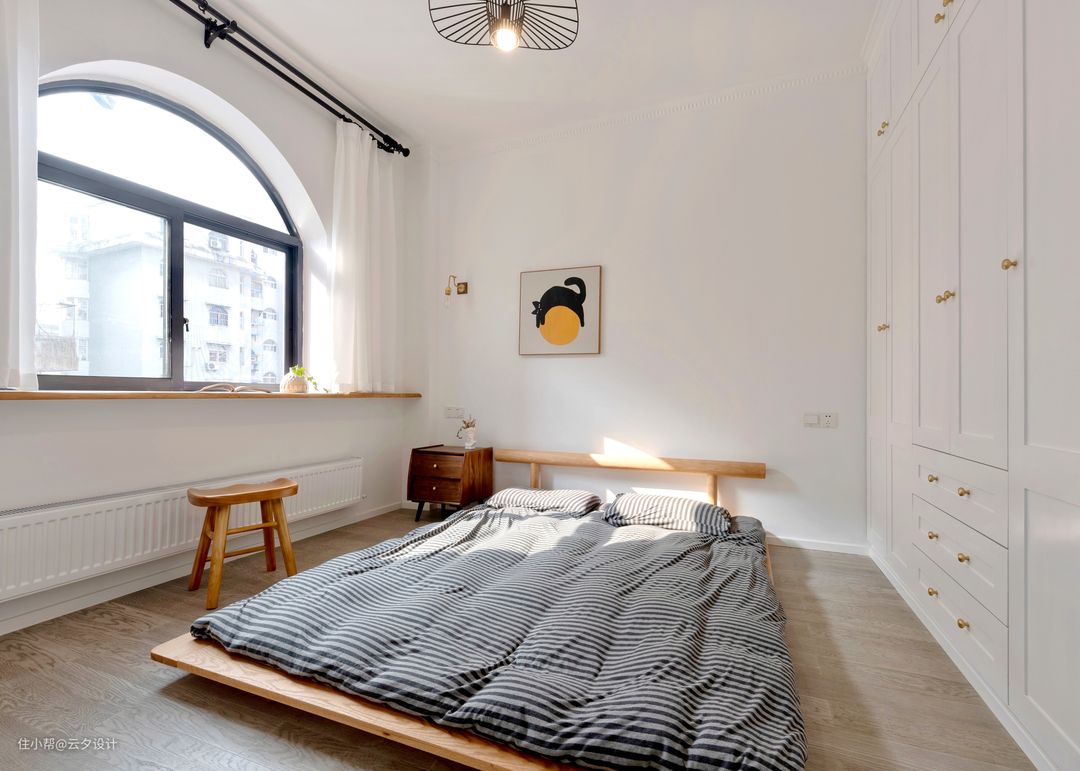 主卧是朝南的,光线非常好,为了不辜负这么好的朝向,我们把飘窗加宽,做成了一个悬挂式的书桌,也可以作为一个小型梳妆台,主卧的床做的是无脚落地床,这个是根据业主MM的生活习惯,后期可以调整。灯具也选择的是比较轻盈的灯,整体氛围都比较轻松的感觉。