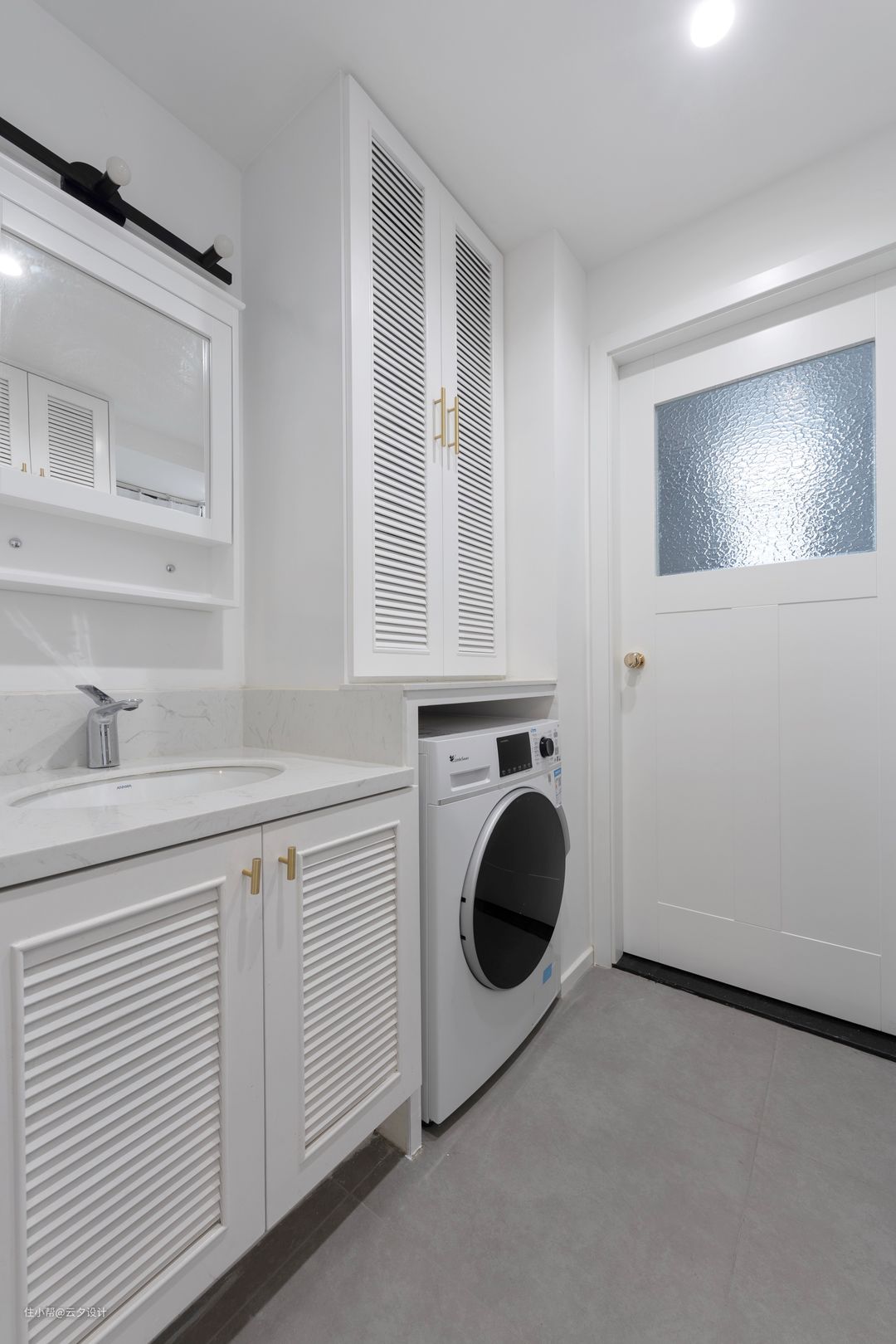 这个小小的走廊几乎满足了家里所有的重要电器,洗衣机在厕所门左边,和浴室柜一起,便于后期排水与检修,烘干机在门的右边,烘干机上面还有一个很大的台面,可以放脏衣篓,可以说是一个比较功能性的一个走廊。