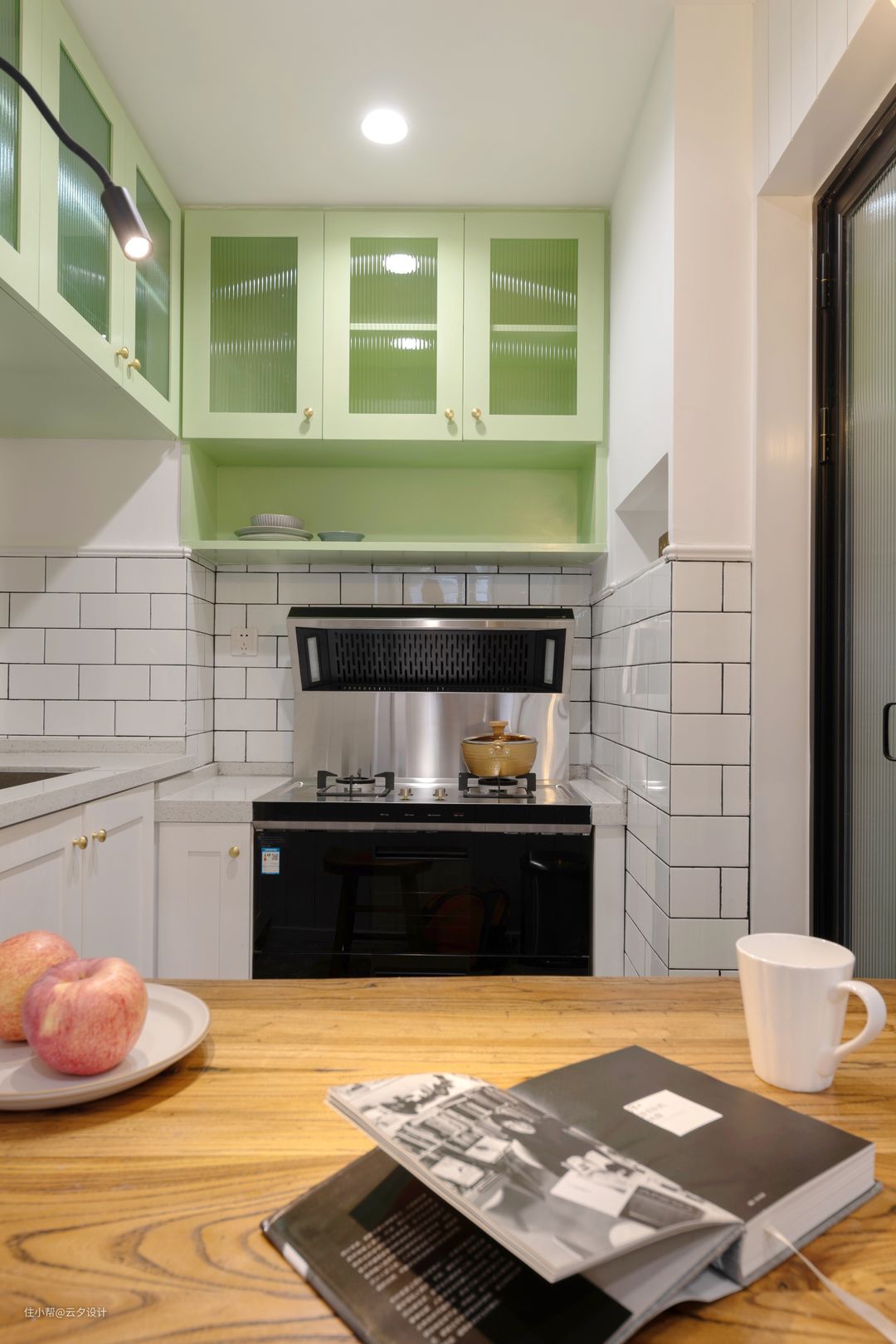 入户用了一个清新的绿色,与户外的陈旧形成对比,有眼前一亮的感觉,厨房与过道用鞋柜做隔断,半开放的厨房用长虹玻璃做的折叠门。