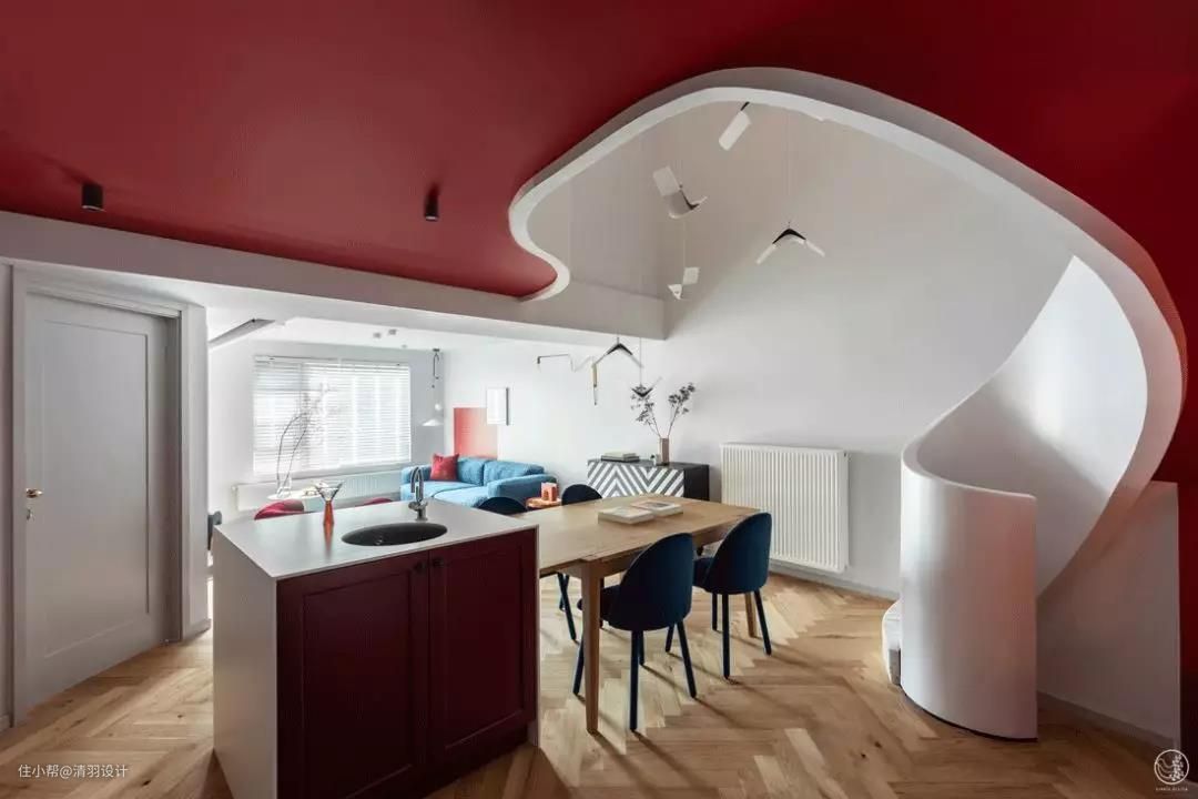 在客厅一角一道浪花般平地卷起的弧线连接起了上下的空间,流线型的楼梯扶手我们用了最纯粹的白色,因它分隔而得来的下部空间我们用了反差感强烈的正红色,不娇艳也许有些夸张,但这个空间缺了它好似丢了魂魄。