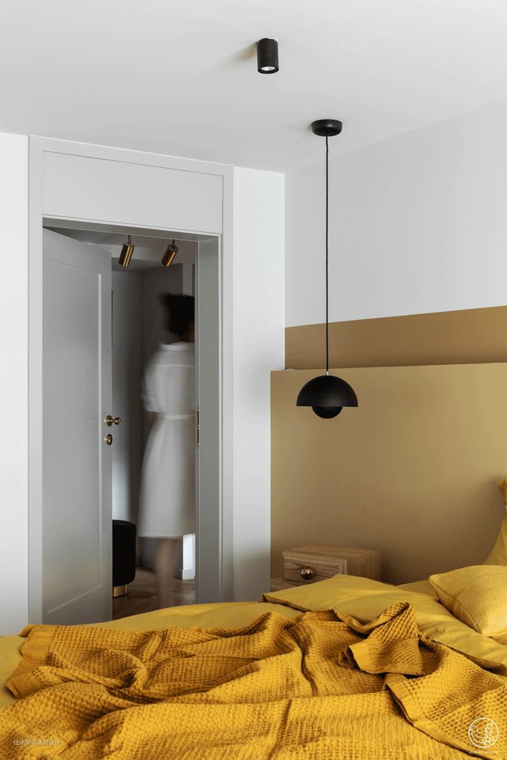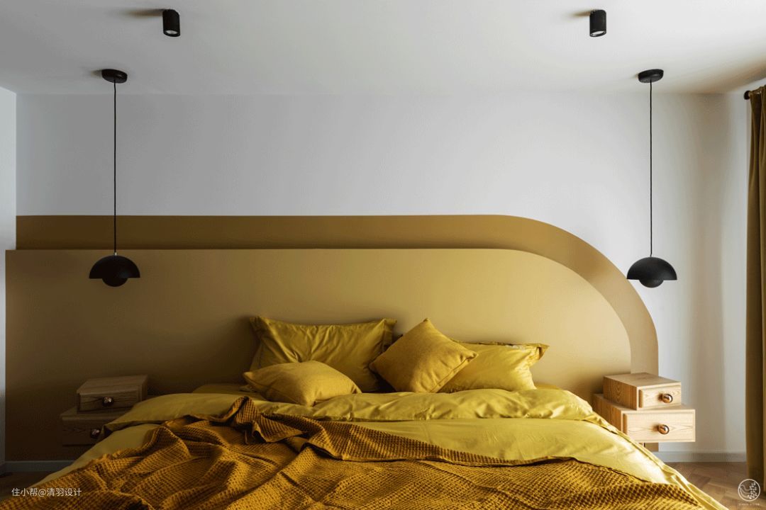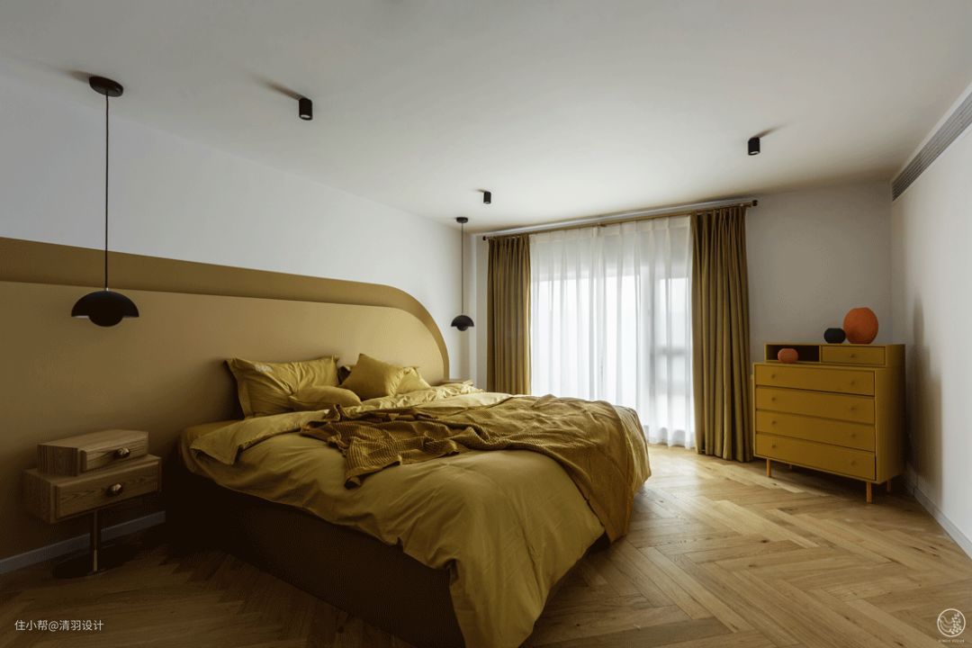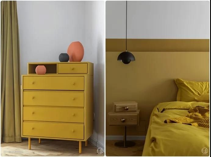 由楼梯上来,转过头便能被一组明快的黄色搭配所吸引。明朗的葵花黄斗柜、藤黄色窗帘、同色系定制床头半包围、床头柜、姜黄色的床单……深浅各异的黄几乎主导了整个空间,有着让人看到就不自觉嘴角上扬的魔力。