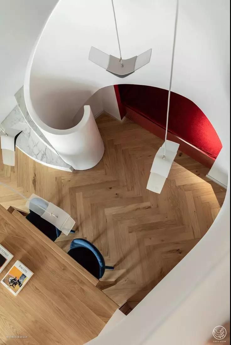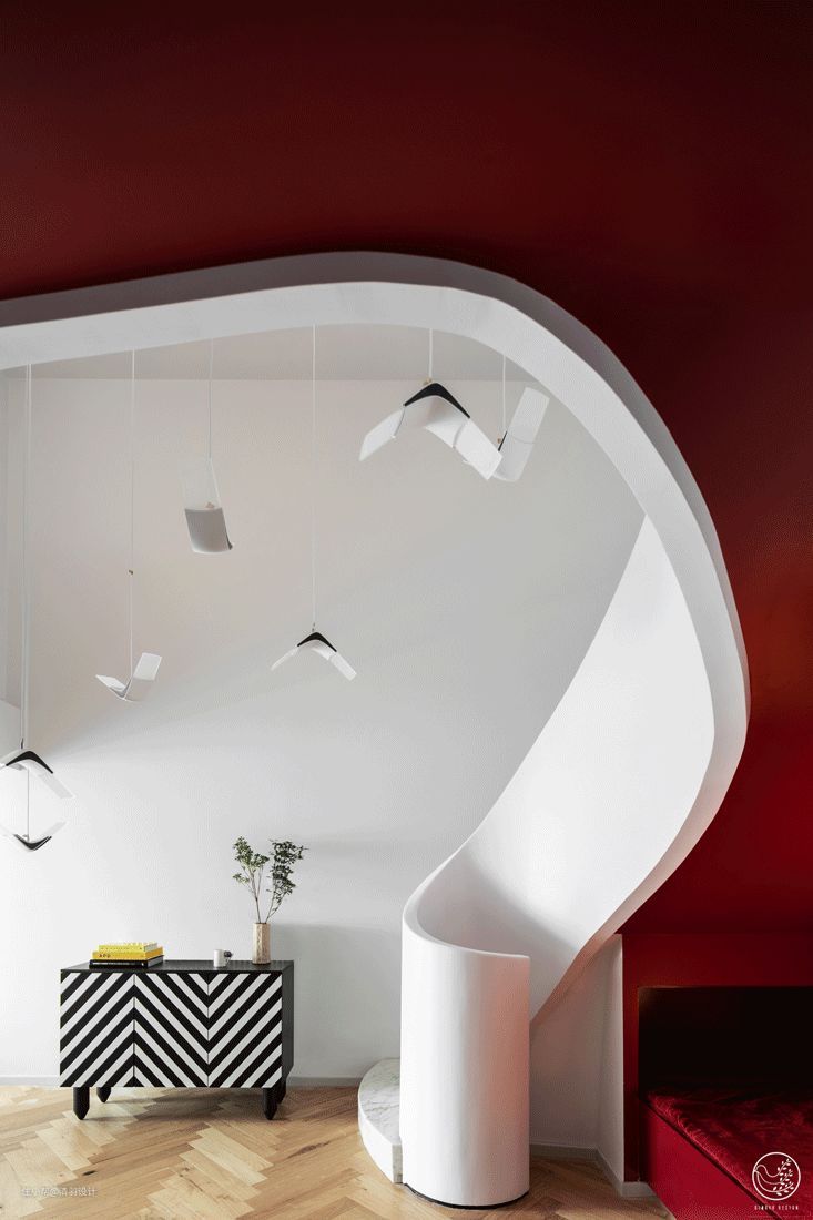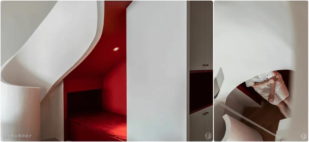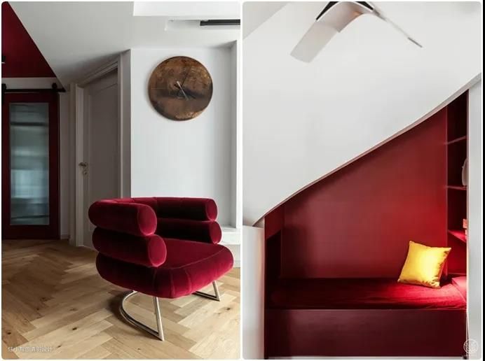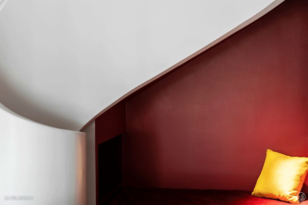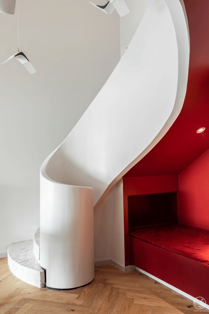 在客厅一角一道浪花般平地卷起的弧线连接起了上下的空间,流线型的楼梯扶手我们用了最纯粹的白色,因它分隔而得来的下部空间我们用了反差感强烈的正红色,不娇艳也许有些夸张,但这个空间缺了它好似丢了魂魄。