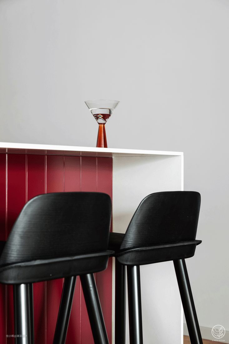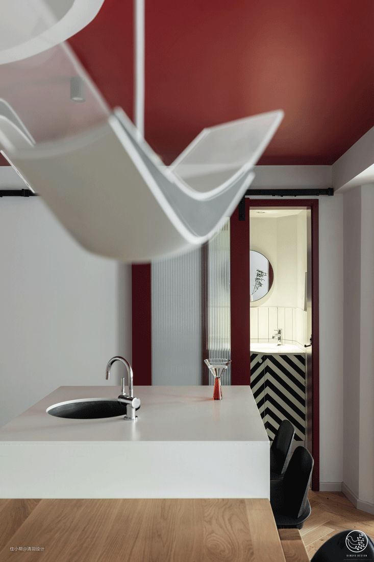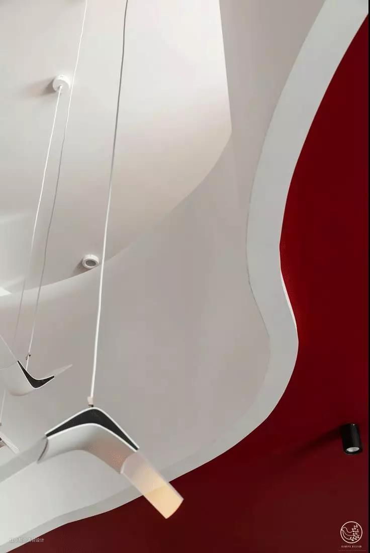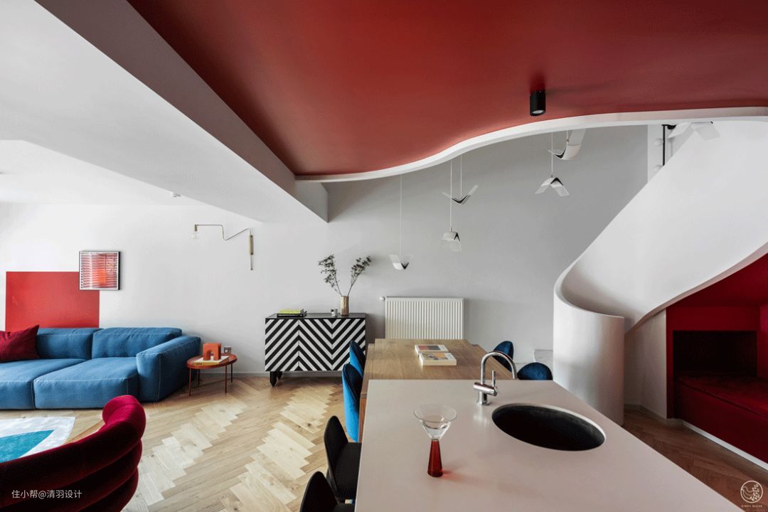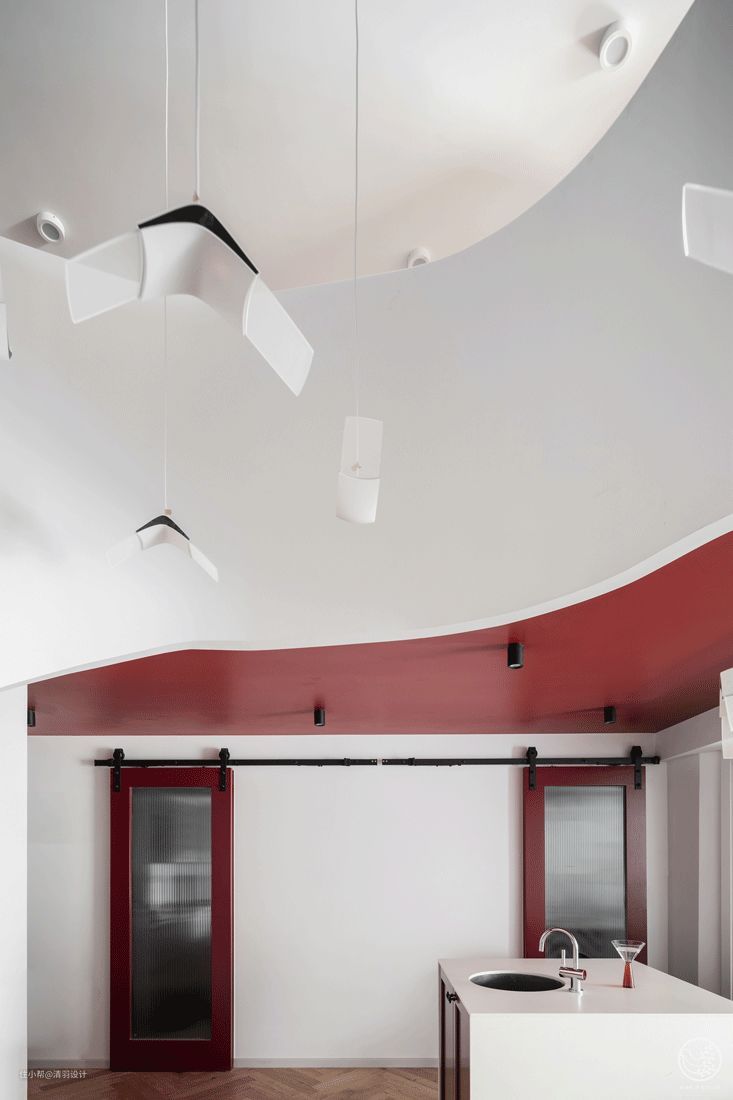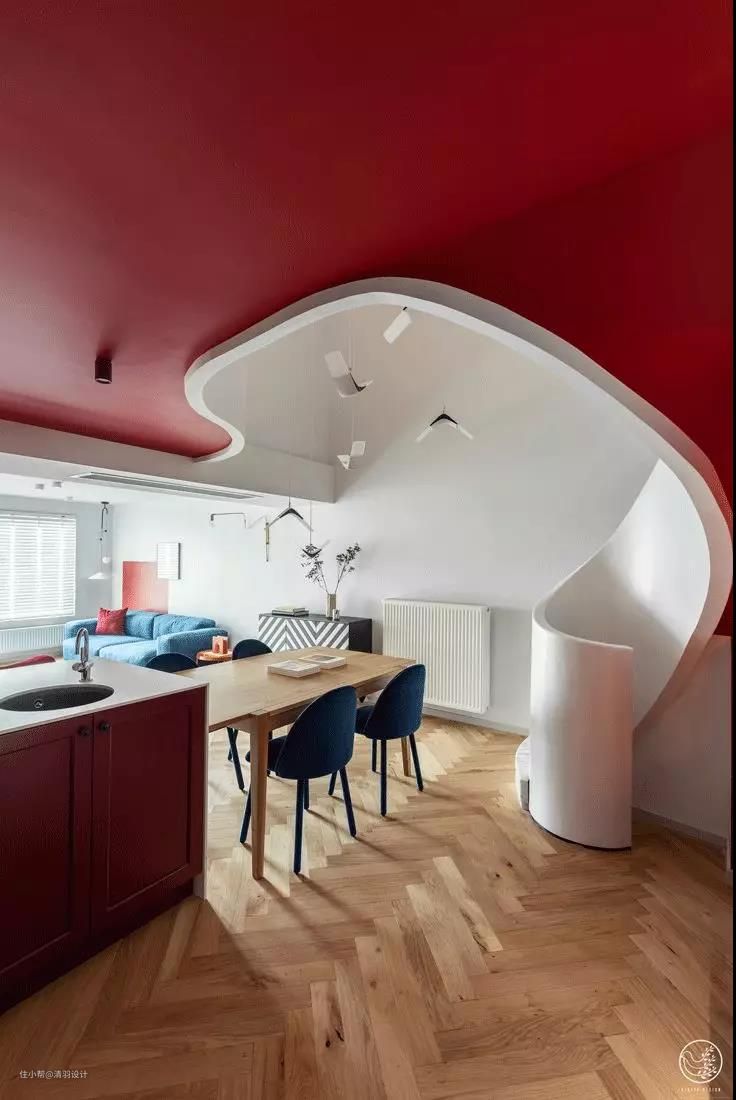 在客厅一角一道浪花般平地卷起的弧线连接起了上下的空间,流线型的楼梯扶手我们用了最纯粹的白色,因它分隔而得来的下部空间我们用了反差感强烈的正红色,不娇艳也许有些夸张,但这个空间缺了它好似丢了魂魄。
