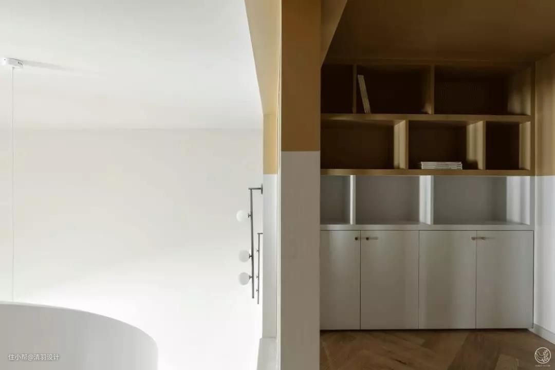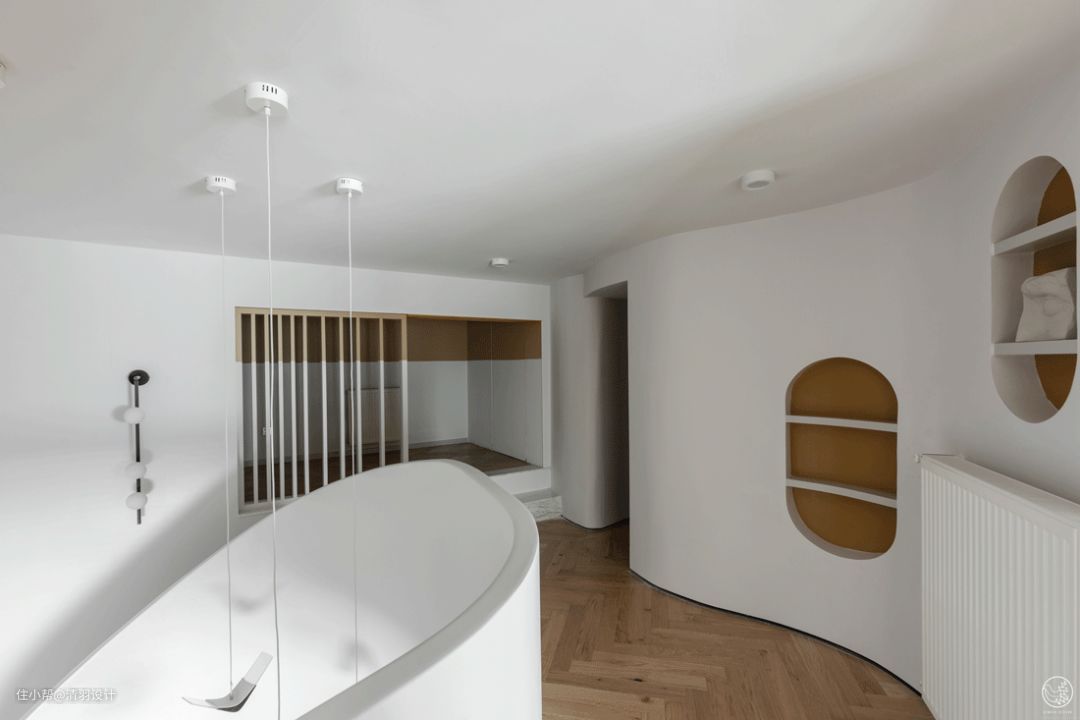 由台阶至上的空间主要是休憩的地方,整体的色调也更趋于平和宁静。 不多言的男主人对我们提出了唯一的要求便是:不想压缩层高。于是全屋都采用了暖气片取代地暖,却也刚刚好地让墙面有了别样的层次感。
