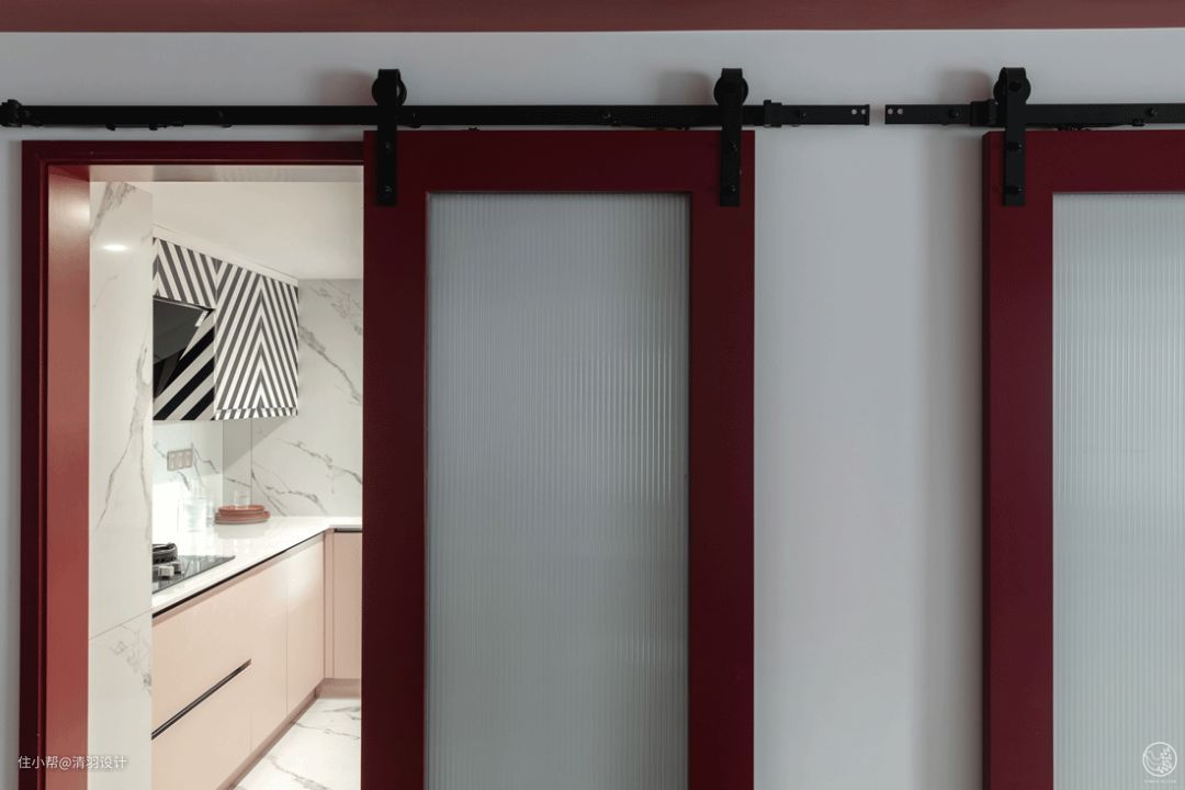 我们以镶嵌长虹玻璃的谷仓门作为厨房、一楼卫生间与餐厅间出入的屏障。