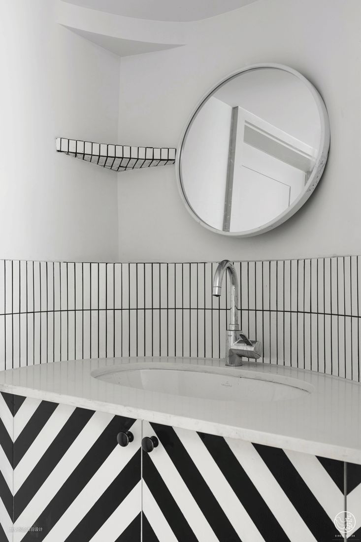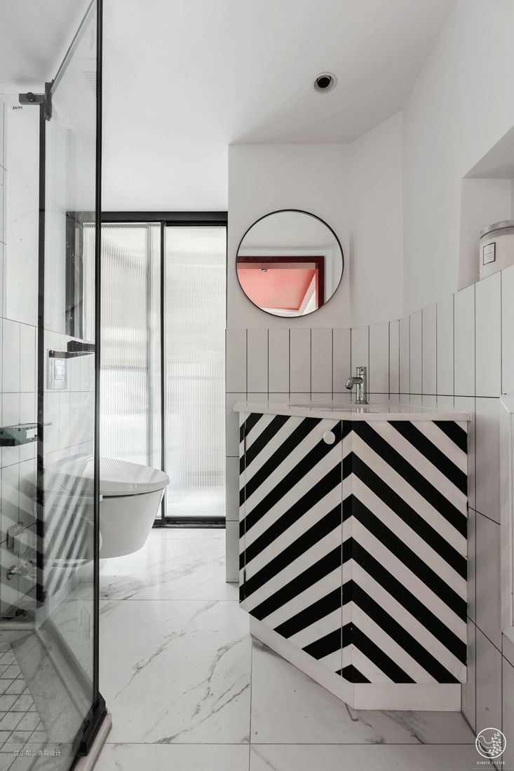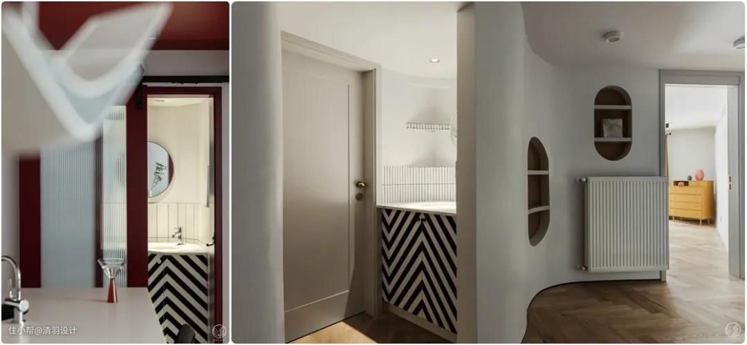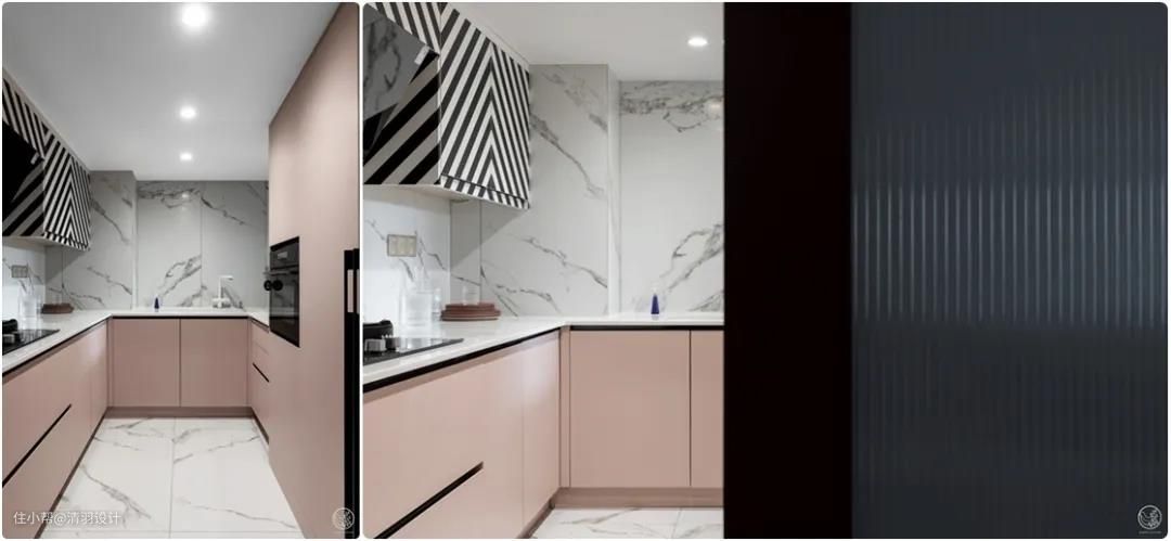 能一眼被注意到的是,黑白相间的几何波浪纹元素是我们在每一个空间加入的“共同点”,点缀也串起每一个空间之间的气息。大理石纹理的墙砖搭配柔和的粉色橱柜,高级感之外隐隐昭示着这个家里谁最常与它“分工协作”。