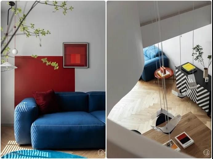 有电视、有茶几、有沙发、明亮的窗户前有百叶窗、有红蓝cp配色,没有光怪陆离与出其不意,反而是这一次它最自在的表现方式。可是当你放松的往沙发扶手上随意靠下,却又能惊奇的发现新大陆。