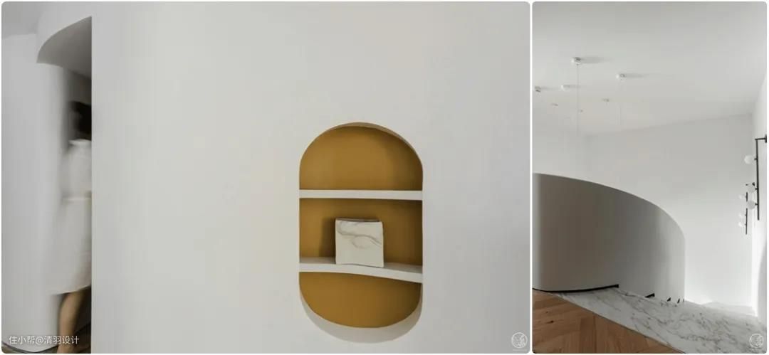 楼梯作为本案最费工时的存在,它也展露出了与设计施工中的苛责所匹配的美。 我们尽最大可能让它拥有一气呵成的优美弧度,内嵌式踢脚设计与之融为一体,与大理石材梯步搭配出干净井然的视觉效果,也凸显出对细节的极致要求之于品质感的重要性