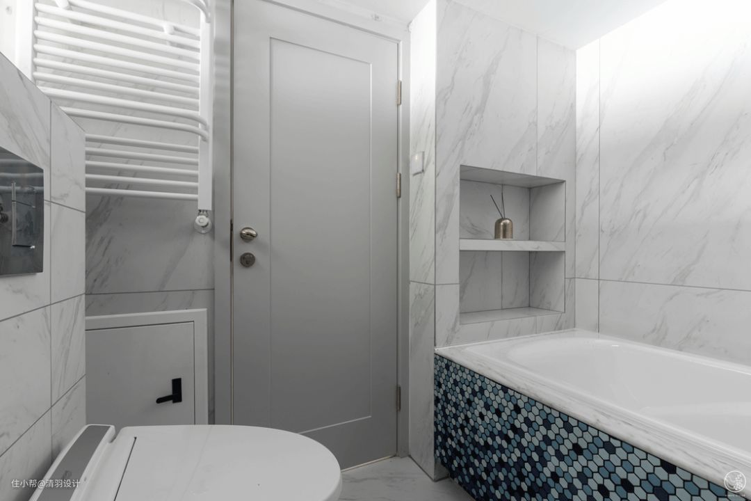 一楼的卫生间相对狭长,利用墙体与淋浴房做了干湿分区。再延伸出去则是生活阳台,以长虹玻璃镶嵌黑色金属窄框的推拉门作为分隔,既保证空间的私密性也充分地满足了室内采光。 而二楼的格局则是绝对的干湿分区,洗浴空间中在浴缸外加入了一些梦幻感的马赛克铺贴,去呼应楼下的那一片温柔的“海”。