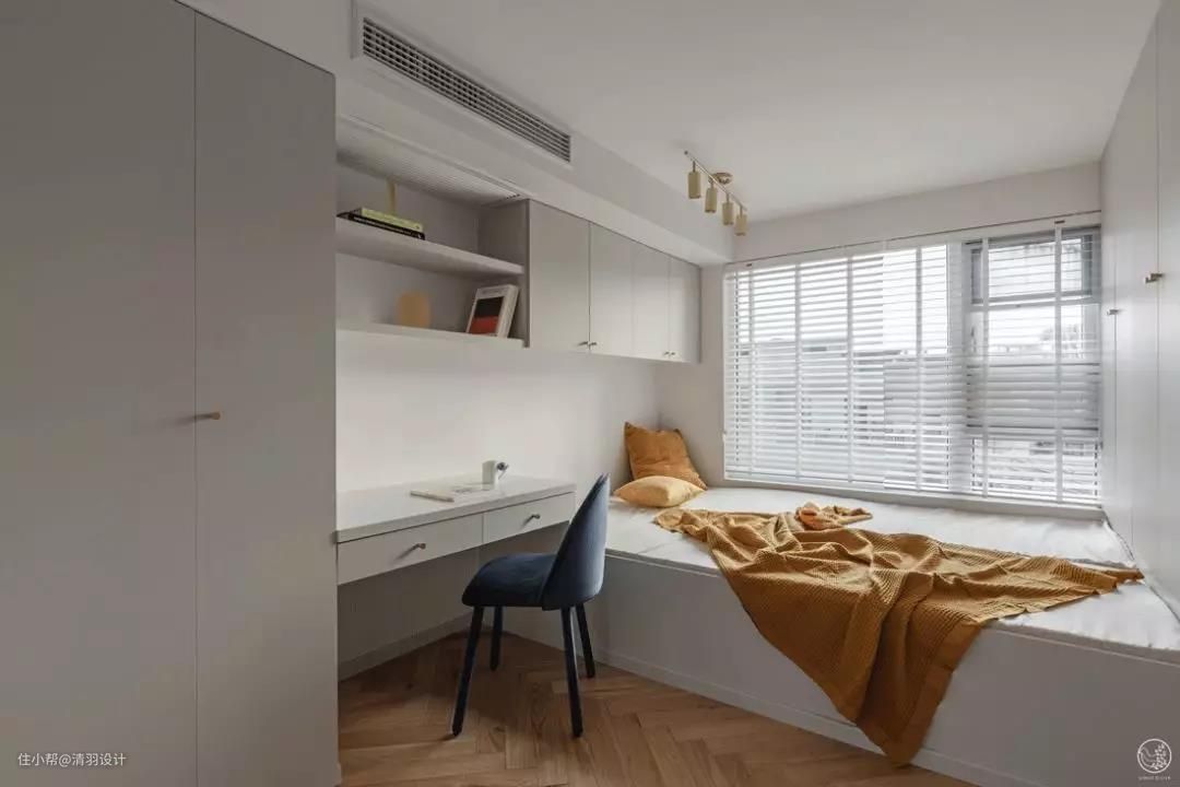 这里的衣帽间我们把它设置成了独立的,床头旁推开一扇奶油灰色的小门,进去别有洞天。
